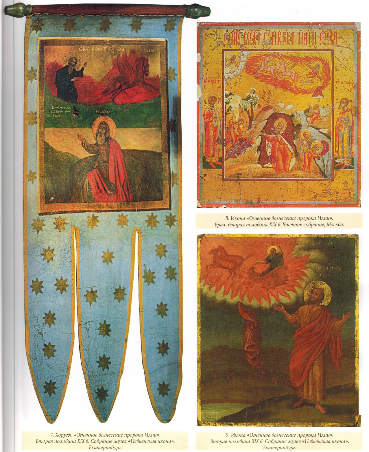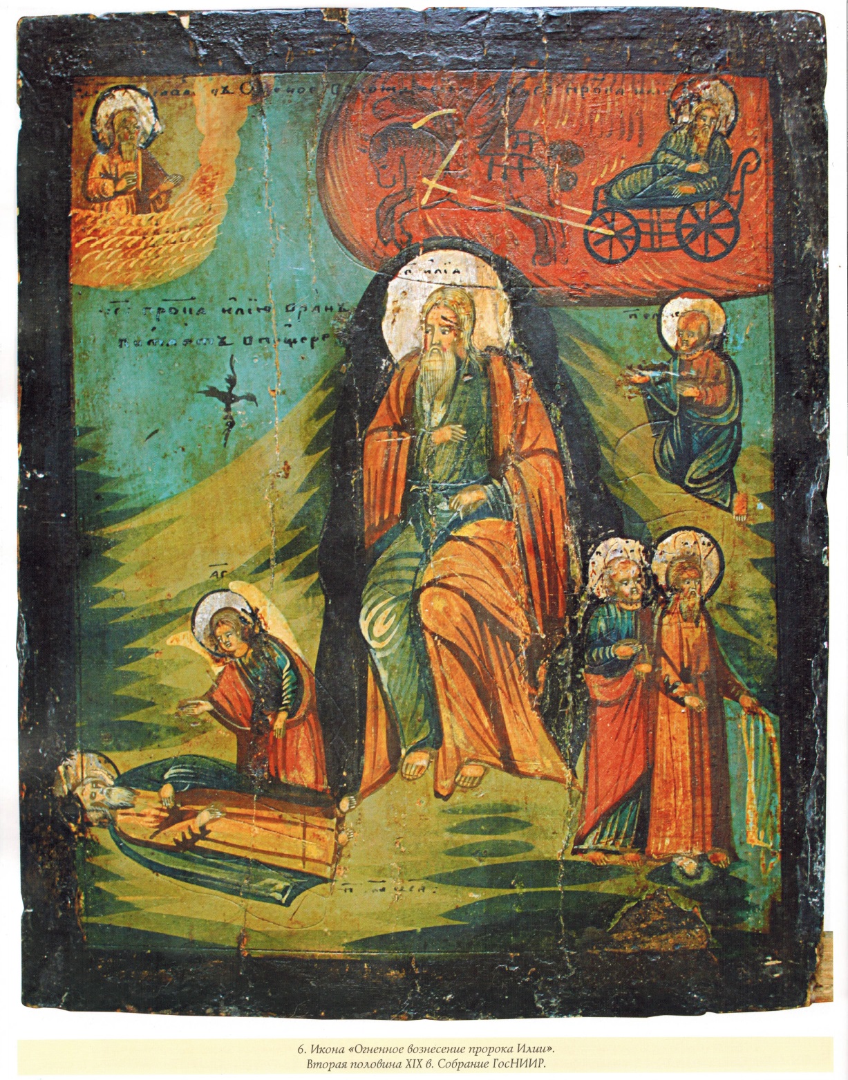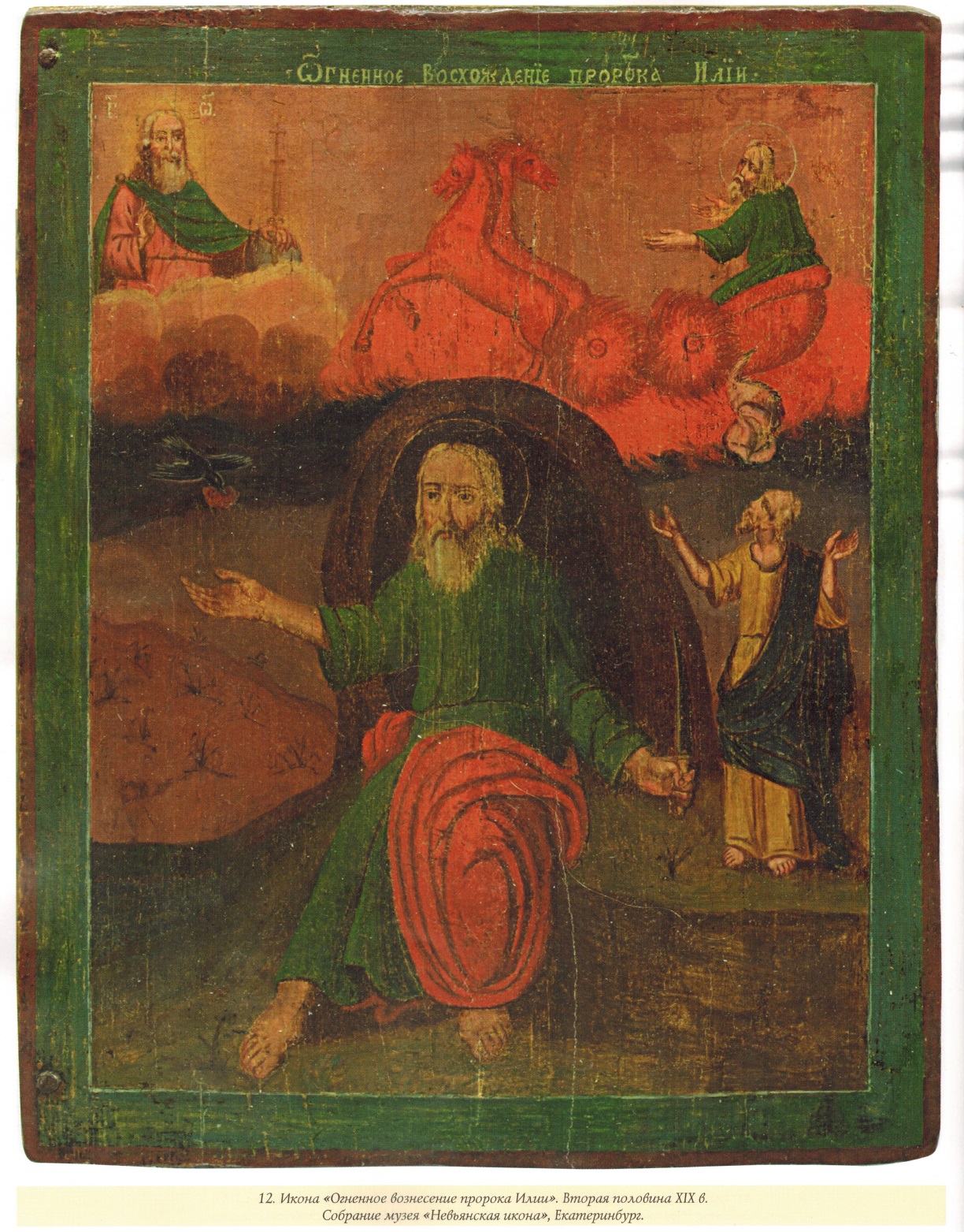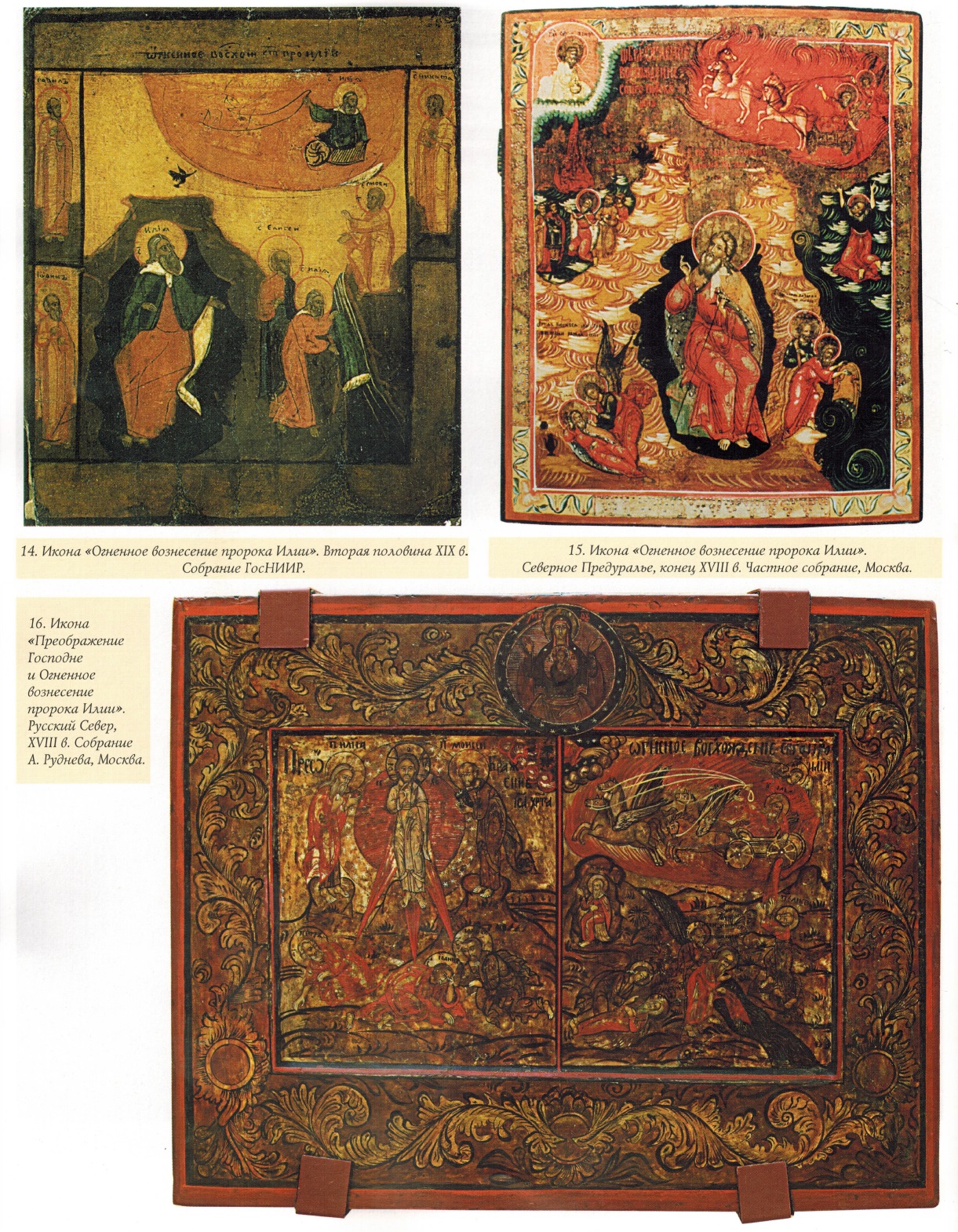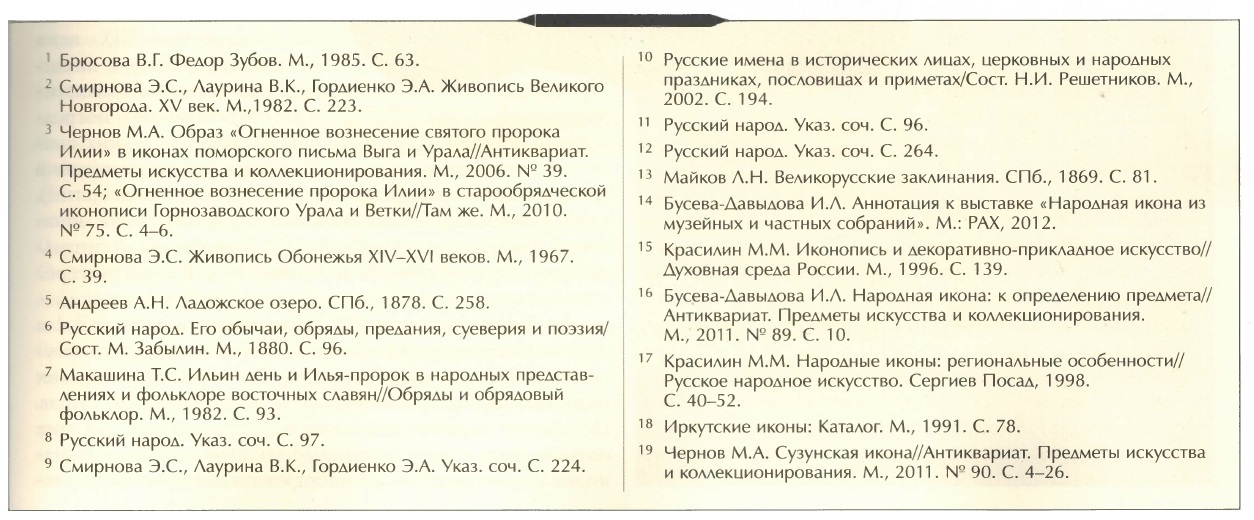 Для народной иконы в целом (в отличие, скажем, от «скорописной» иконы) характерны такие неоднократно отмечавшиеся исследователями признаки, как грубая обработка доски, схематичность и разреженность композиции, монохромность, упрощенное написание личного, угловатость и непропорциональность фигур и ряд других. По справедливому утверждению И.Л. Бусевой-Давыдовой, типичное для народной иконы «отсечение» всего необязательного, схематизация композиций, сведение деталей к своеобразным знакам способствовало вычленению сути моленного образа. Главная каноническая задача иконы — возведение ума к первообразному — могла успешно осуществляться даже «подокладницами», где единый образ как бы расчленялся между доской (лики) и окладом (фигуры)»14. Данными признаками в полной мере обладают и иконы «Огненное вознесение пророка Илии», представленные на выставке *