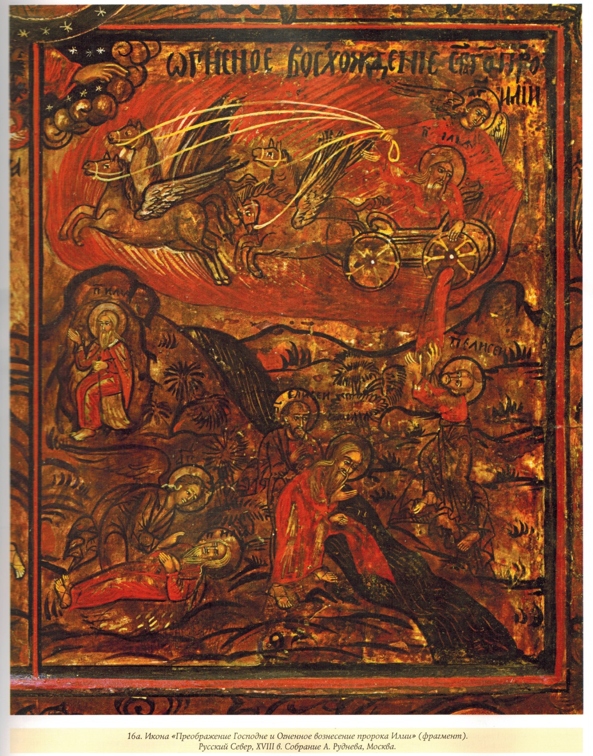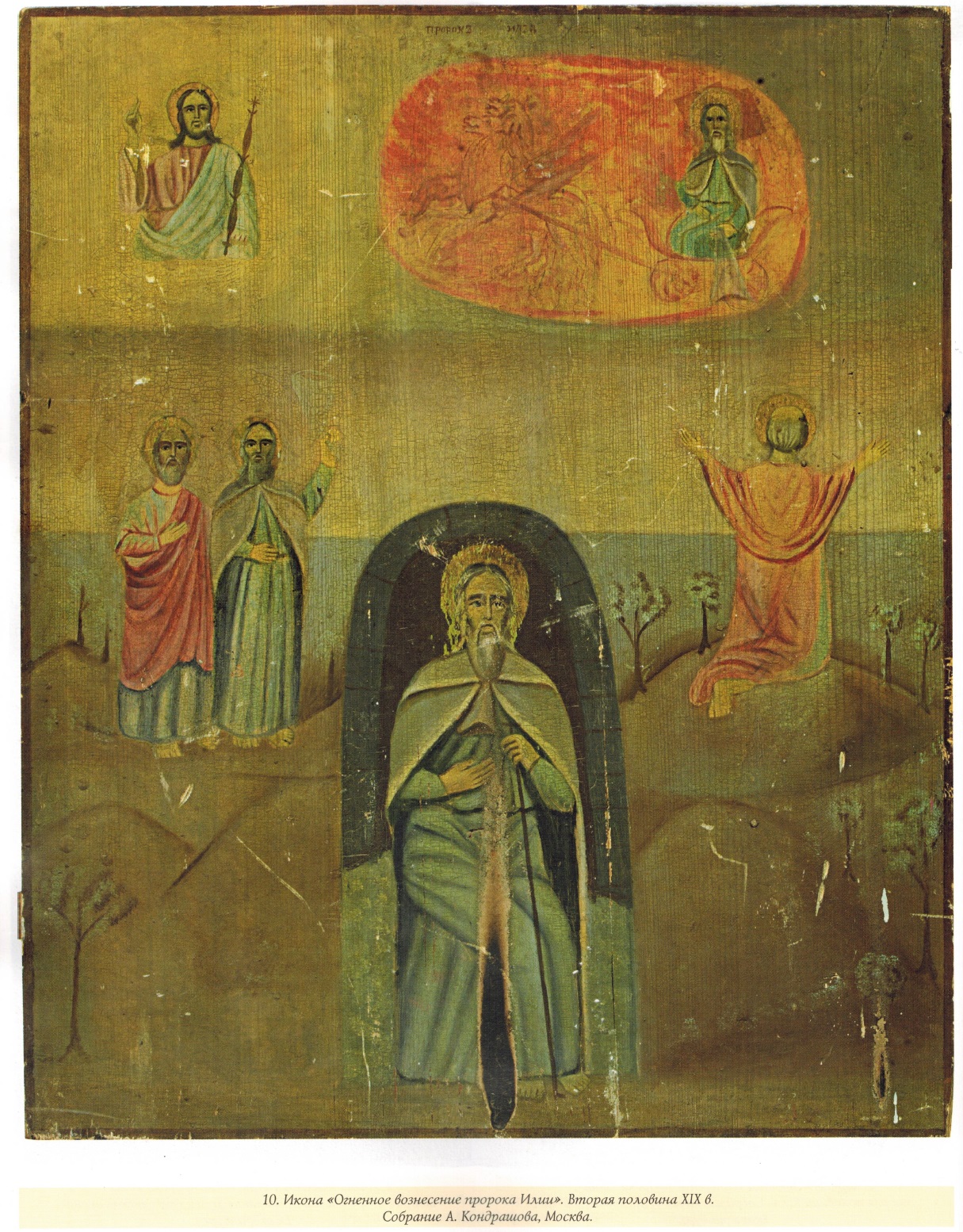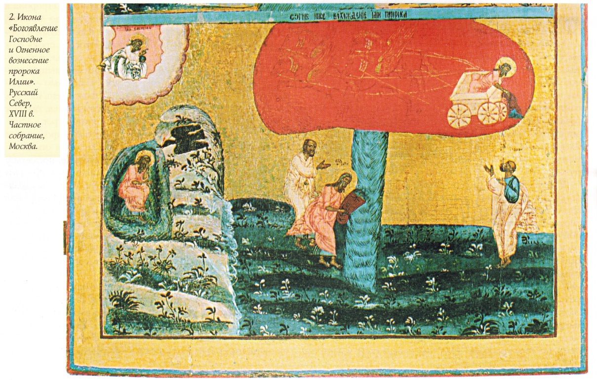 Под примитивом здесь следует понимать «освоение типологии и форм профессиональной академической живописи хтдожниками-самоучками, как правило, низкого социального статуса»16. В иконописи он характерен прежде всего для южнорусских губерний, а также Сибири, куда многие сибирские архиереи, выходцы с Украины, привозили своих земляков-художников17. На представленной иконе «Огненное вознесение пророка Илии» из Иркутского областного художественного музея (илл. 18) иконописец, подражая художникам-академистам, развернул сцену вознесения на фоне хорошо узнаваемого пейзажа с панорамой Ангары18.