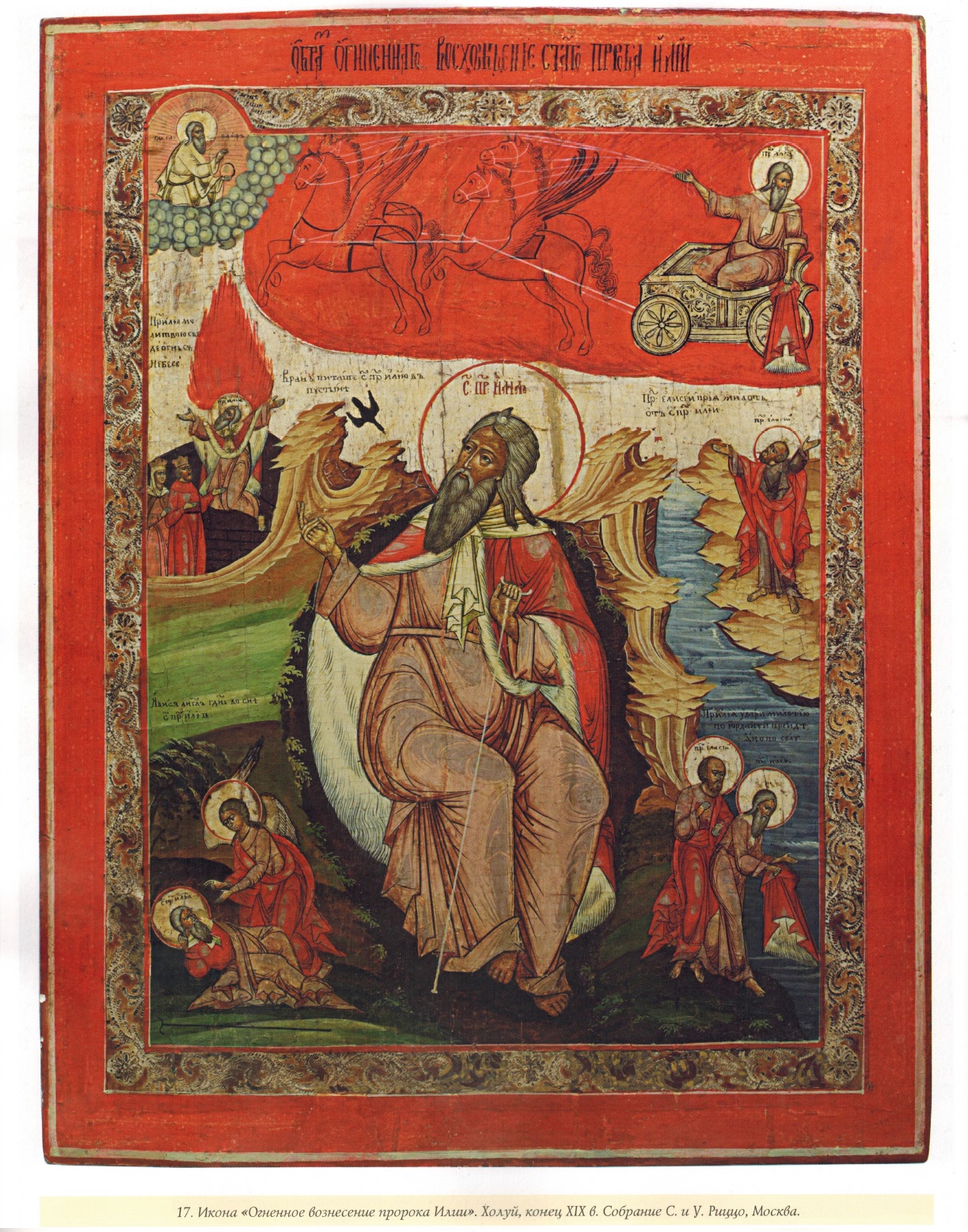 присутствие двух основных сюжетов: Илья Пророк в пустыне и его огненное вознесение; иногда добавлены сцены перехода через Иордан и явление ангела спящему Илье (илл. 2—13). Огненная колесница может представлять собой, например, простой ящик с одним колесом (илл. 14) — такое живописное решение занимавшийся исследованием этого образа М.М. Красилин назвал «шедевром иконописной знаковой системы»15. Кроме того, на народных иконах с вознесением Ильи мы можем увидеть и другие подобные «шедевры», связанные с колесницей: и двухколесную, напоминающую рикшу, пролетку (илл. 11), и отдельно находящиеся от повозки колеса (илл. 12), и лошадей, «участливо» наблюдающих передачу милоти пророку Елисею (илл 4). На полях ряда народных икон встречается орнамент, близкий по росписи к домашней мебели и утвари (илл 15, 16).