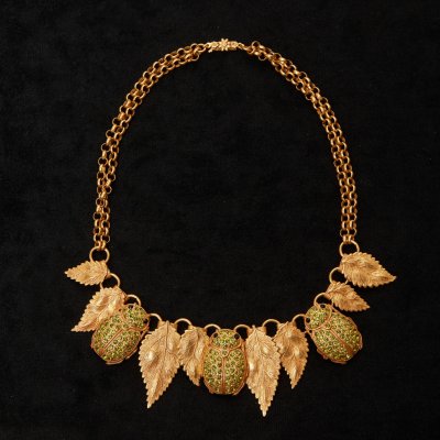 Ожерелье Листья Жуки зеленые камни
