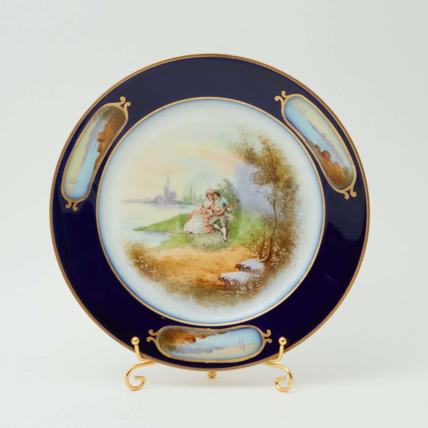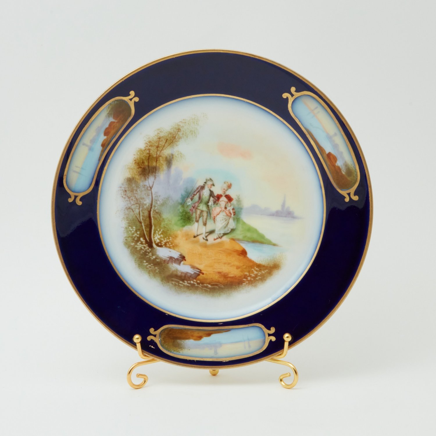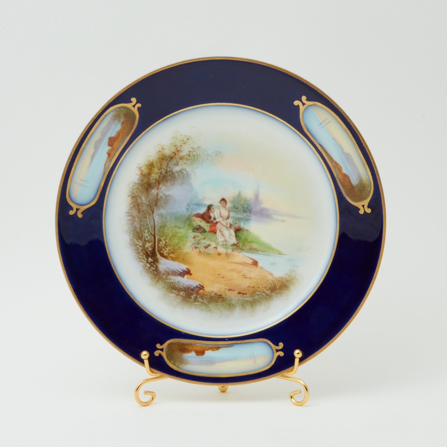 Великолепный фарфор, живописная роспись. Оригинальный дизайн, кант тарелки - покрыт натуральным благородным кобальтом с оригинальными позолоченными медальонами. Всё сделано в лучших традициях Limoges - высочайшего качества. У каждой тарелки своя неповторяющаяся сценка.
