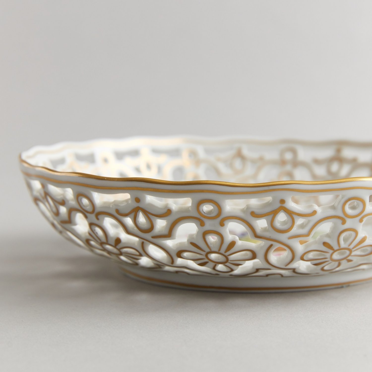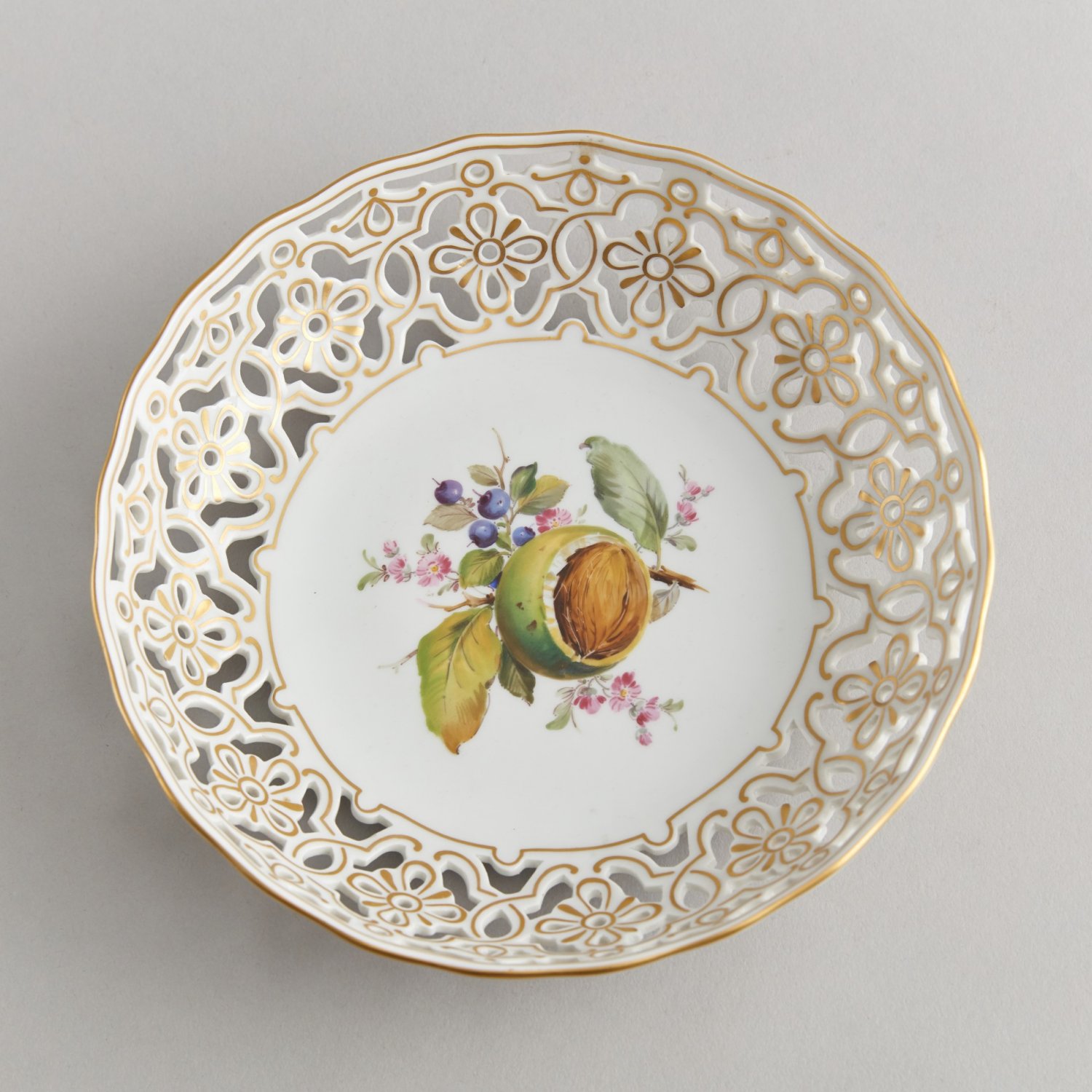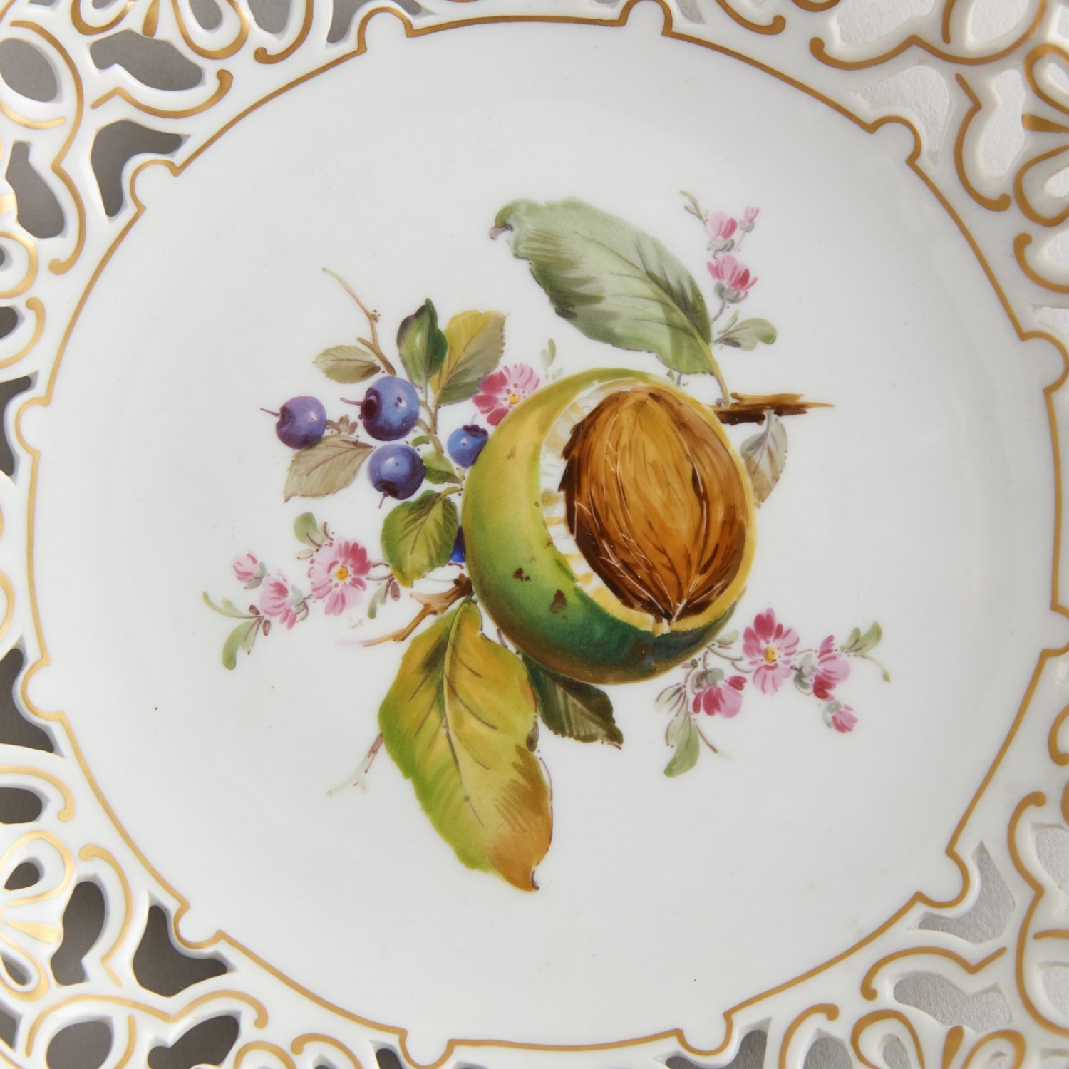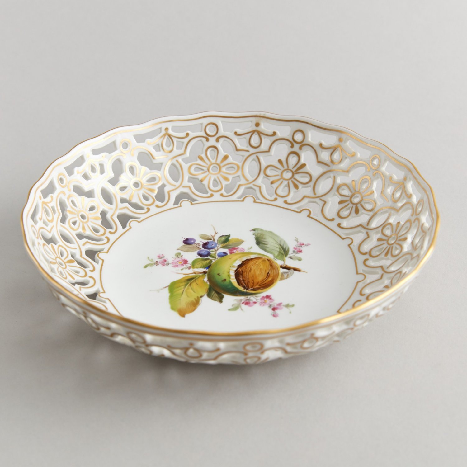 Блюдо украшает резной борт с позолотой и рукописная композиция в центре в виде ветки каштана и черники. Ручная роспись и работа мастера придают блюду неповторимый стиль. Великолепный предмет для любителей фарфора мануфактуры Meissen.