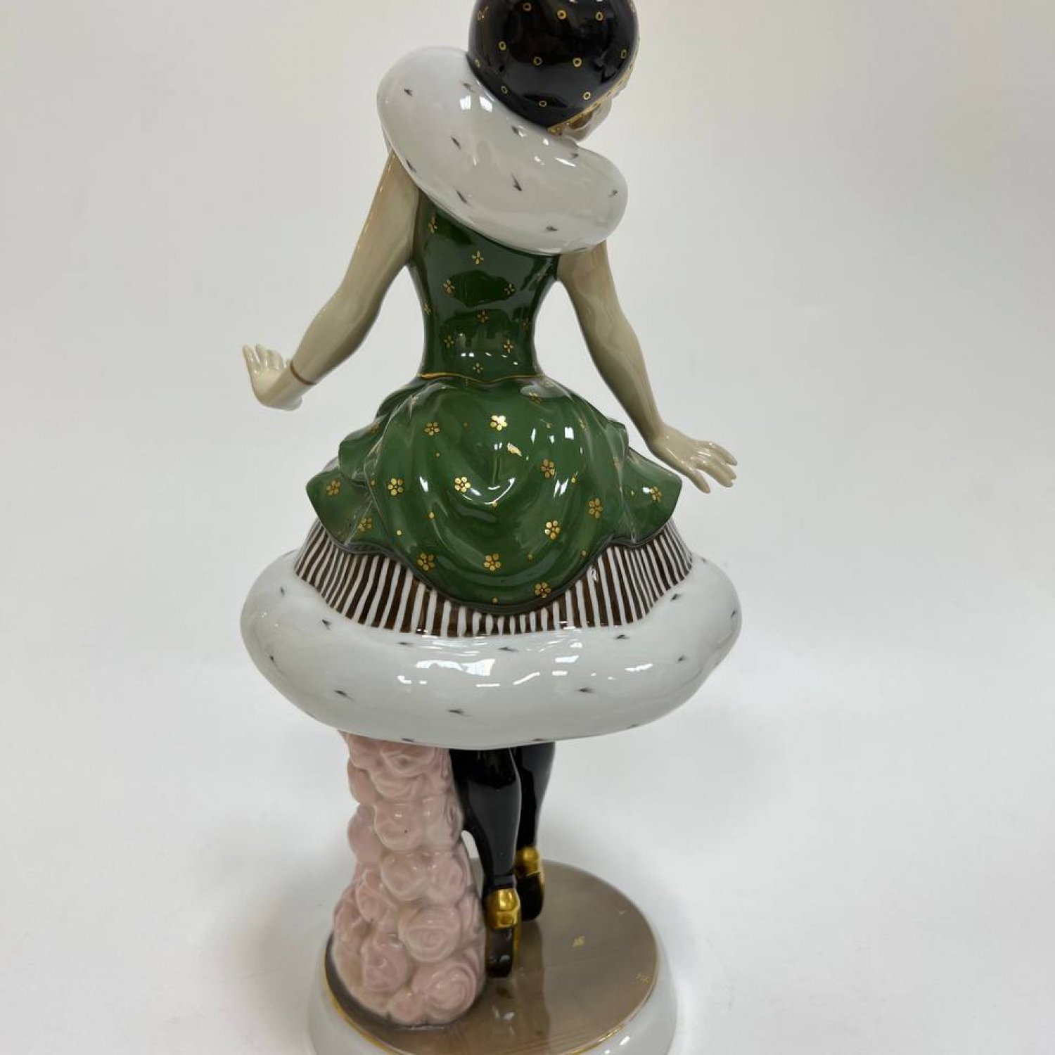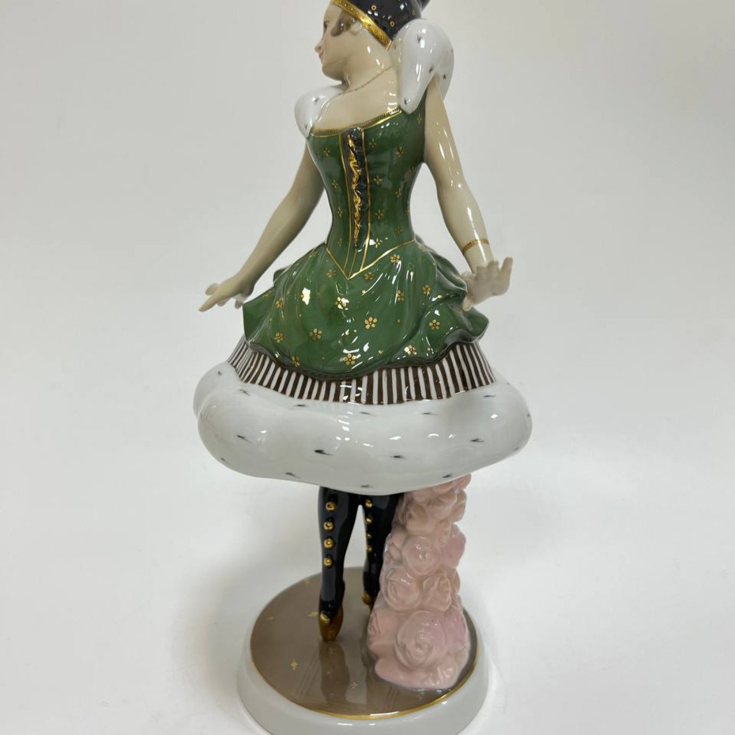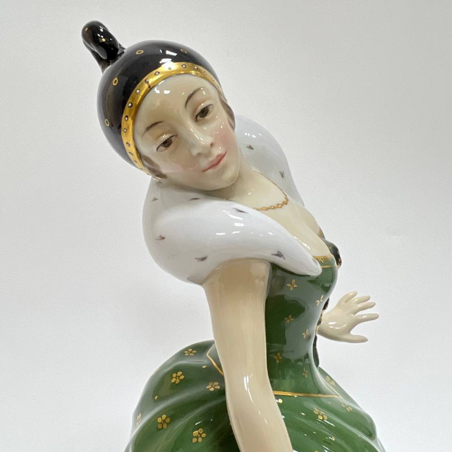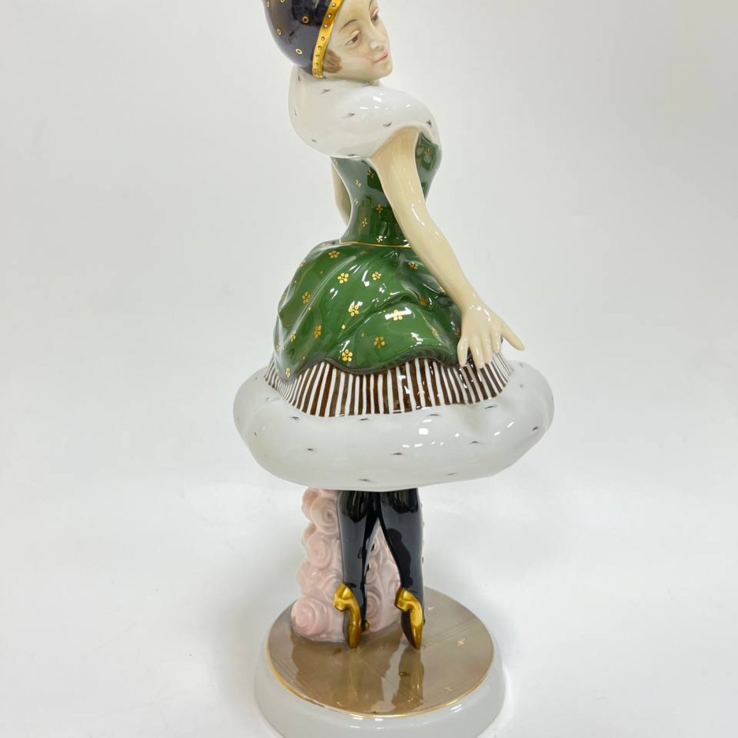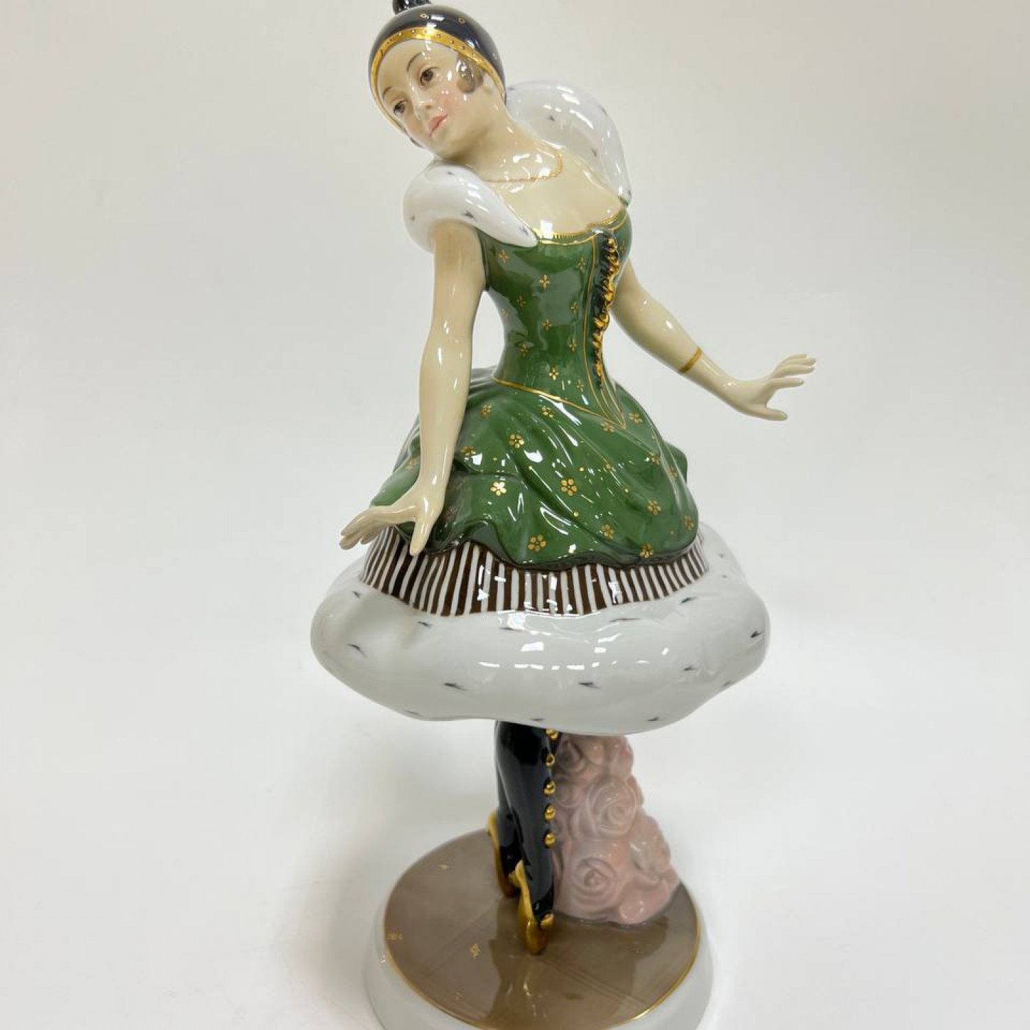 Оригинальная модель художественной мастерской, посвященная знаменитой русской балерине. Статуэтка выполнена в стиле ар-деко, является большой коллекционной редкостью. Балерина изображена стоящей на пуантах, расставив руки, в балетном костюме. Шубка и воротник окрашены под соболь, платье выполнено в насыщенном зеленом цвете и украшено узором из золотых роз. Подпорка сделана в виде рельефных нежно-розовых роз. На голове балерины мы видим головной убор в стиле модерн с простым золотым узором. Подставка имитирует балетную сцену, на ней также имеется узор из небольших золотых цветов. С большой выразительностью выполнено лицо балерины. На нем запечатлено одухотворенное состояние, которое бывает у людей искусства в момент творческой деятельности. Неслучайно немецкие мастера выбрали именно эту балерину в качестве героини. Одна из важнейших страниц в истории культуры России и Германии связана с именем знаменитой балерины, ведущей солистки Мариинского театра Анны Павловой, хрупкой женщины с решительным характером, отважившейся первой показать русский балет европейской публике в начале XX века Выступления русской балетной труппы, в состав которой входила Павлова, в новом Королевском оперном театре в столице Германии прошли с полным триумфом, «которым сдержанный в проявлении своих чувств Берлин венчает очень немногих» . «Казалось, спала маска обычной немецкой корректности, — с восторгом сообщал соотечественникам корреспондент журнала «Рампа и жизнь». Вот выдержки из статьи критика Швинделя в газете Post о впечатлении, произведенном балериной, показавшей себя «виртуозкой танца, почти без соперниц в настоящее время», которая «своей грацией, эластичностью, подвижностью, легкостью дает глазу такое же наслаждение, как уху совершенное пение колоратурного голоса».