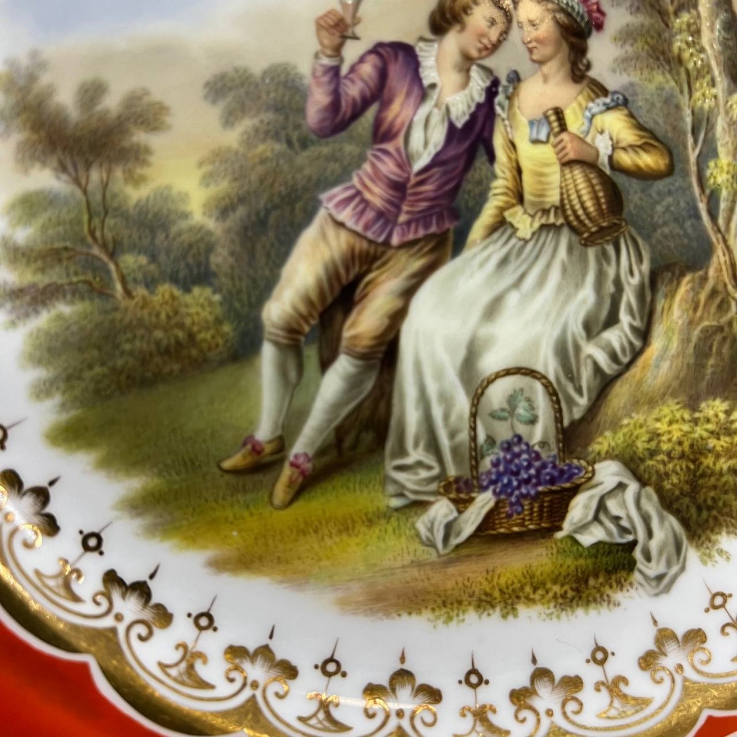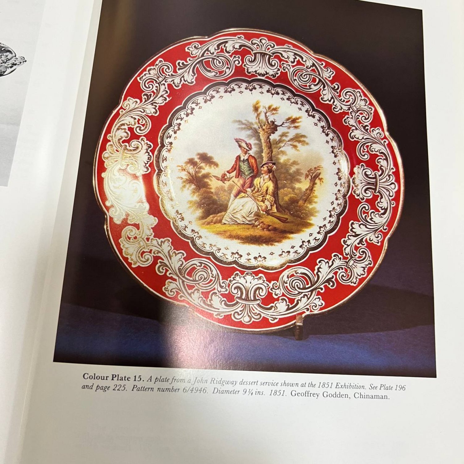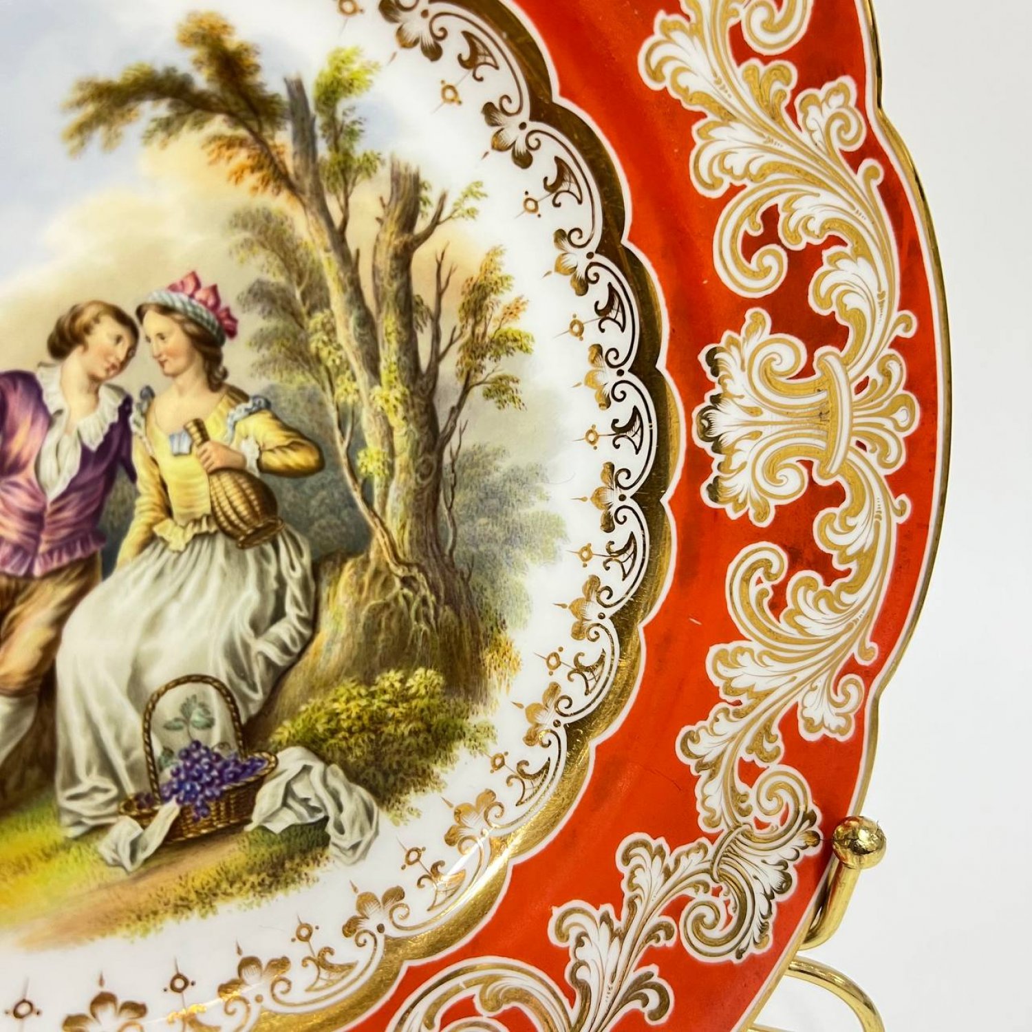 Тарелка 1851г. c галантной сценой по мотивам Ватто из десертного сервиза Rigway .В данном сервизе было 42 предмета.Сервиз был выпущен к выставке 1851 года. Коралловый борт десертной тарелки щедро украшен позолоченным орнаментом,в центре живописная галантная сцена по мотивам художника Ватто.Атрибуция произведена по книге Geoffrey A/Godden "Ridgway Porcelaines",где на обложке изображена тарелка из того же десертного сервиза,и на стр.229 есть фото и описание подобной тарелки .