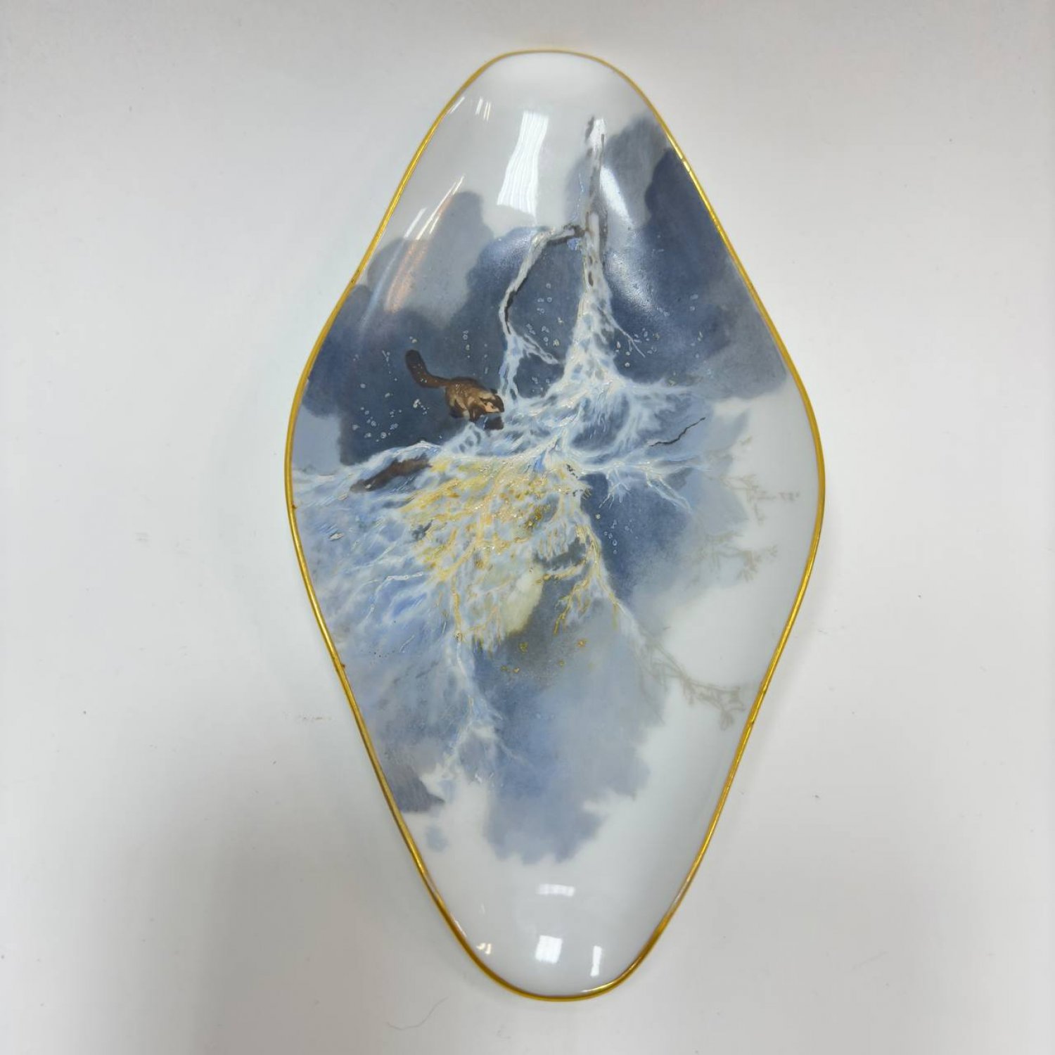 Декоративный лоток с изображением белочки на заснеженных ветках. Автор декора Н. Каразин]