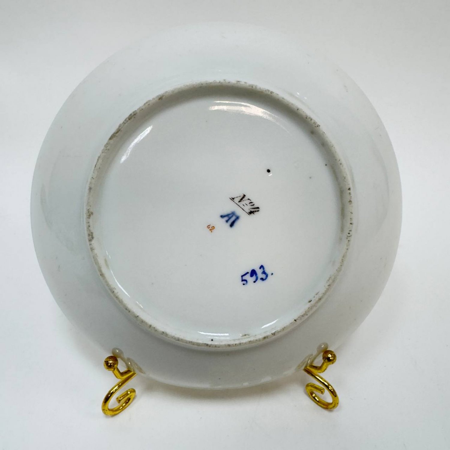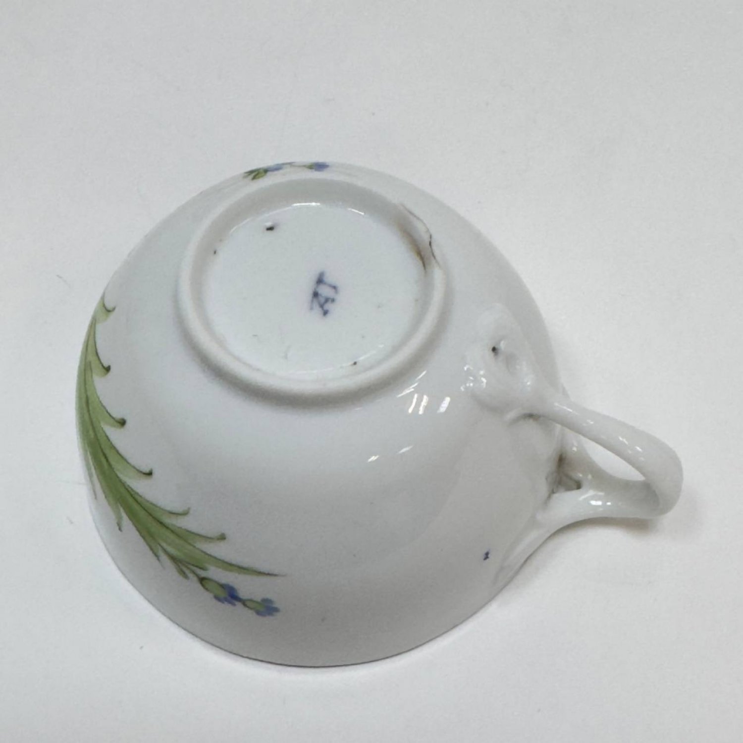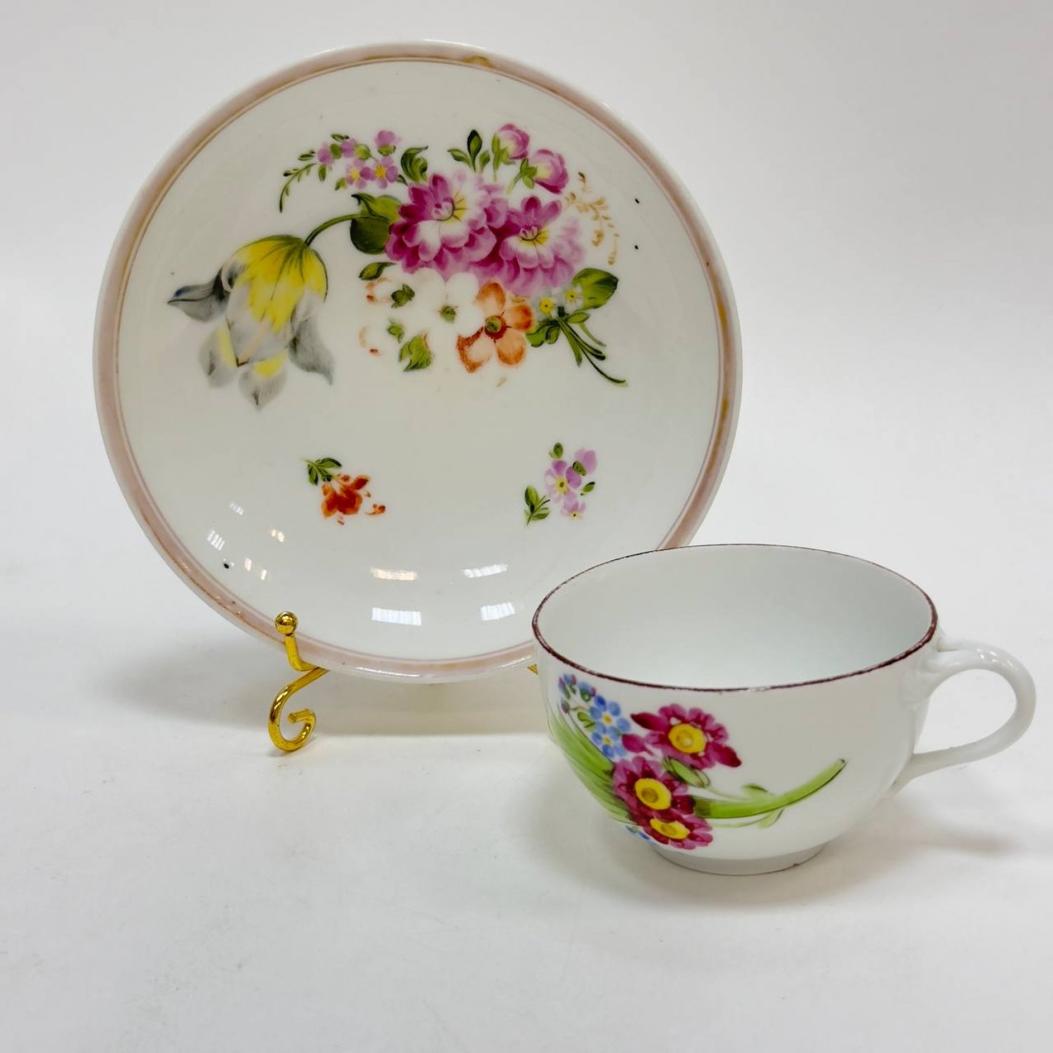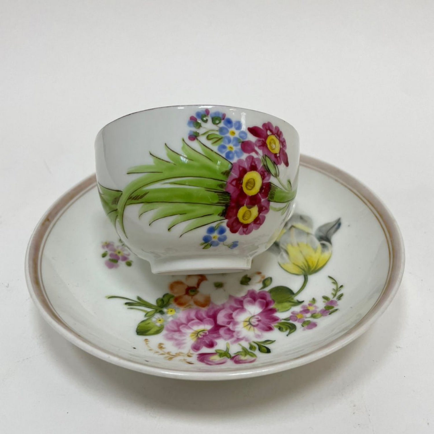 Чашка с блюдцем для кофе, фабрика А. Попова, 1830гг. Надглазурная полихромная роспись-цветы, золочение. Клеймо подглазурное кобальтом АП.