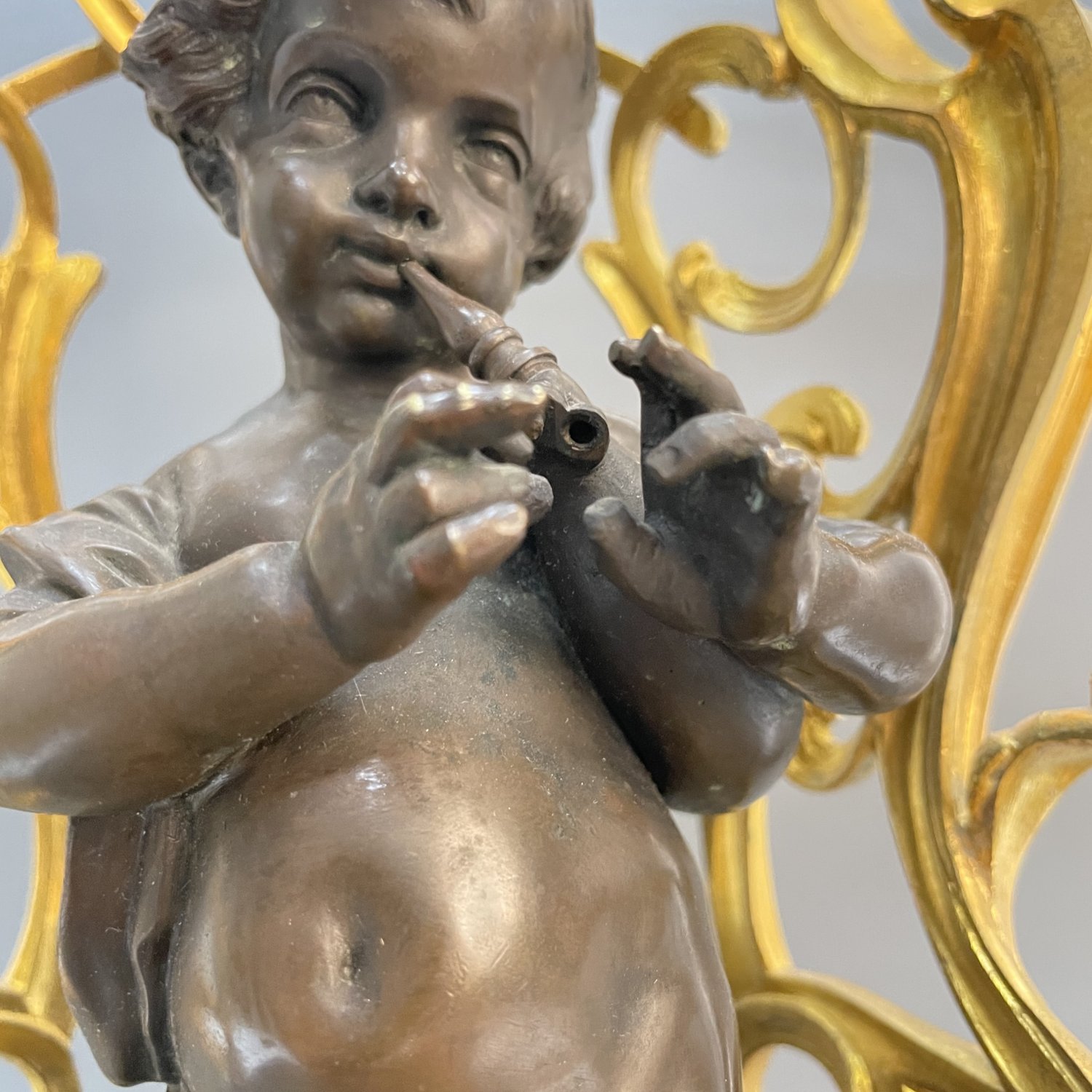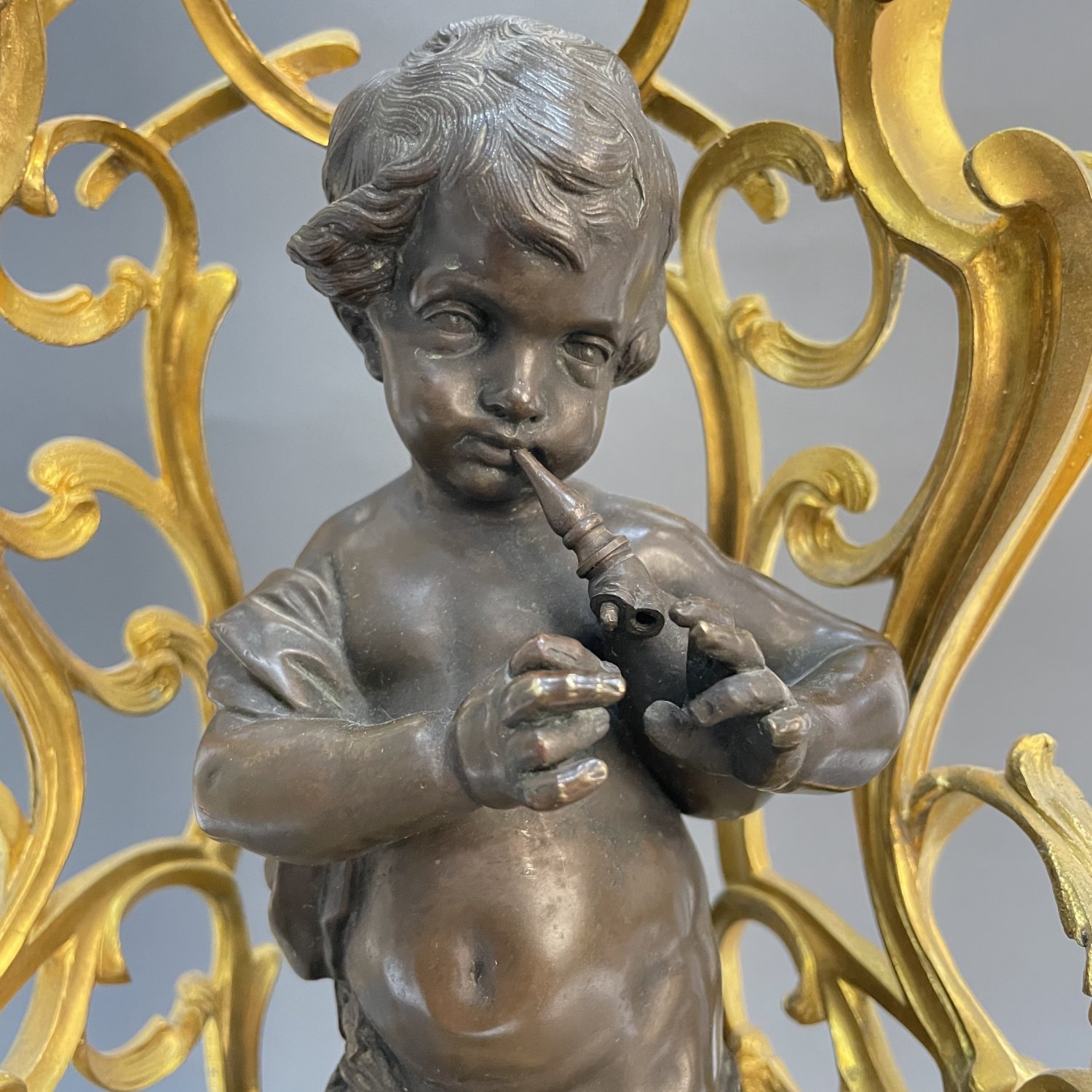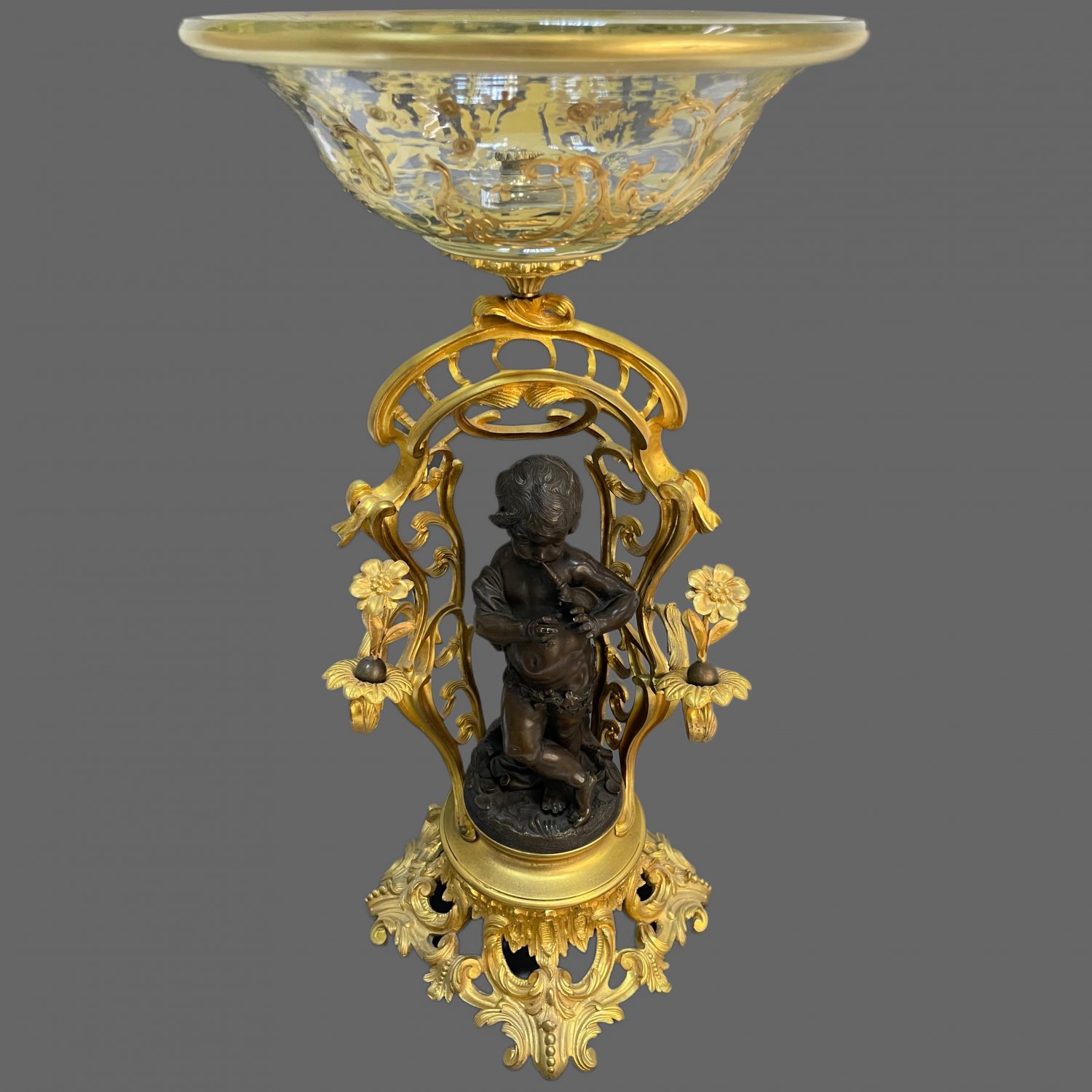 Ваза-центрпис в стиле Неорококо Baccarat, Франция, середина 19 в, бронза с золочением, на основании фигурка мальчика с музыкальным инструментом, с патинированием, хрустальная чаша обильно декорирована рокайльным декором золочеными пастами. Высота 54 см., диаметр чаши 26 см