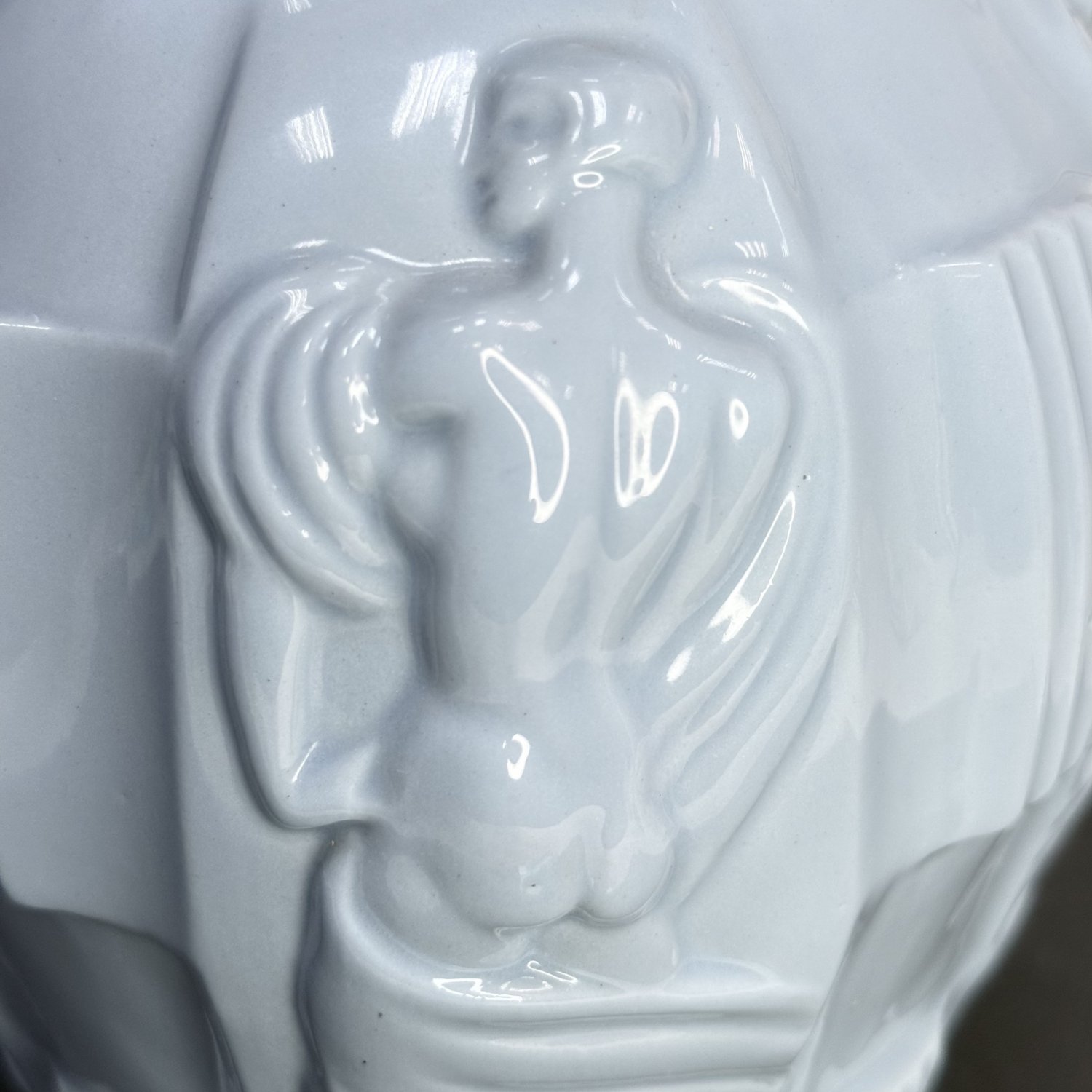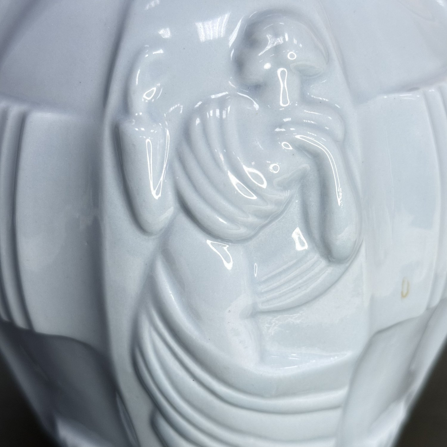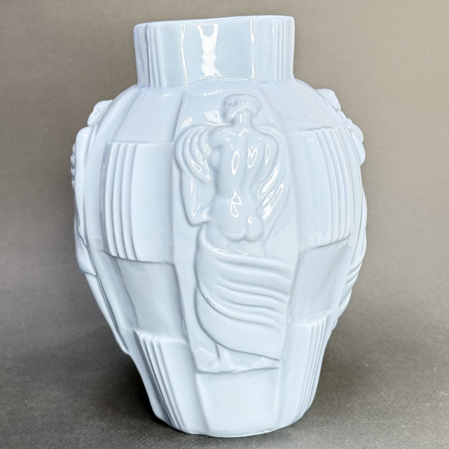 Ваза Ингрид, разработанная Артуром Плевой для Курта Шлевогта в 1936 году, и чаще всего ее можно увидеть в зеленом малахите или синем лазурите, но я никогда раньше не видел ее, сделанную из керамики. Предположительно, это чехословацкая ваза конца 30-х или, может быть, даже 50-х годов. Матово-бело-голубого цвета, с разными обнаженными фигурами, которые окружают всю вазу. В отличном состоянии. Размер: высота 21 см, диаметр тулова 15 см, диаметр основания 8,5 см, диаметр горловины 9 см