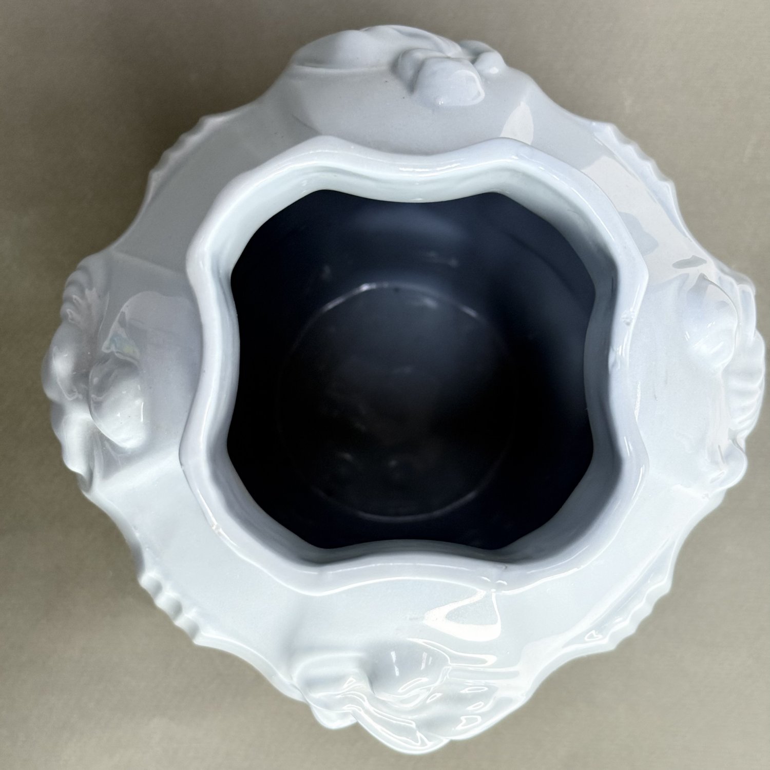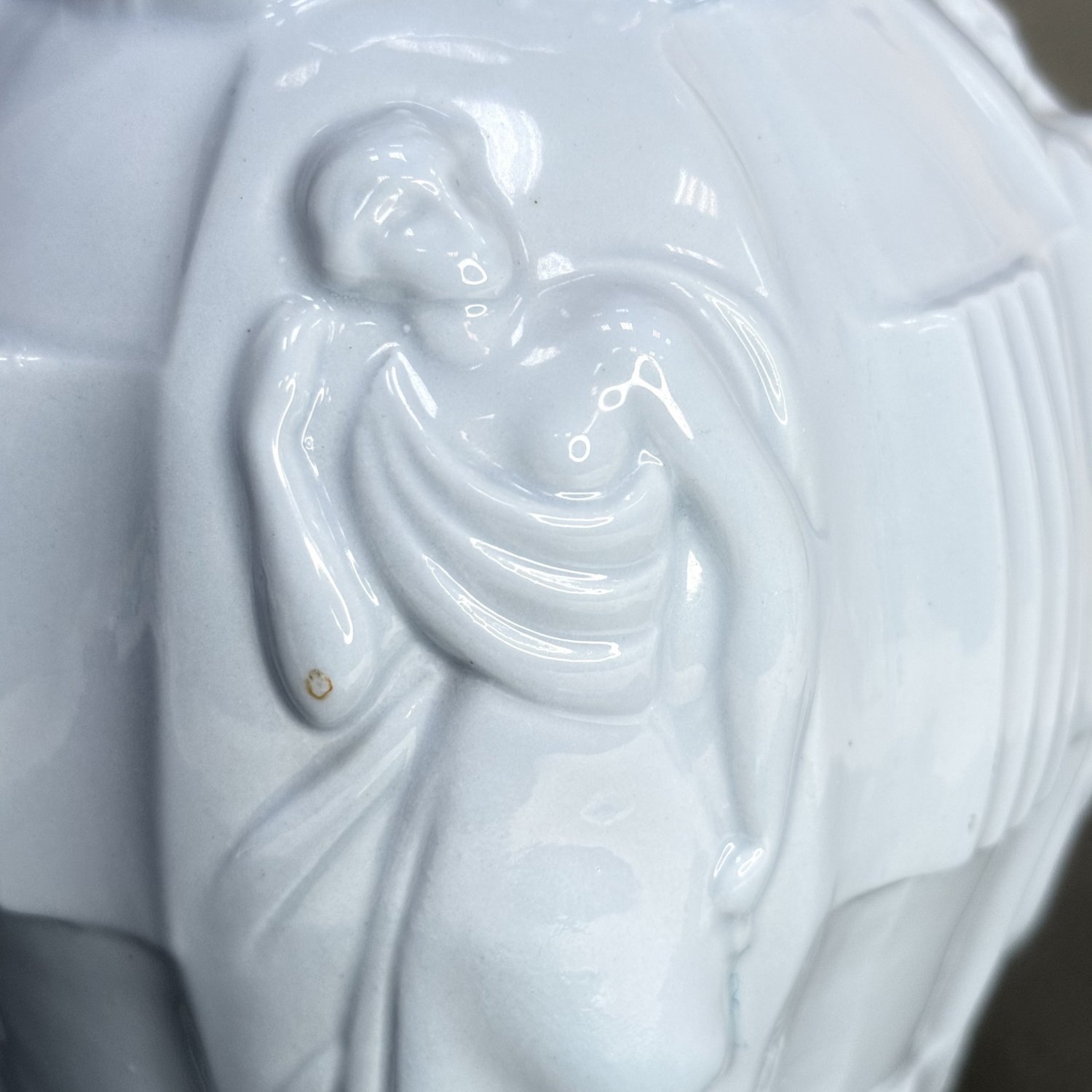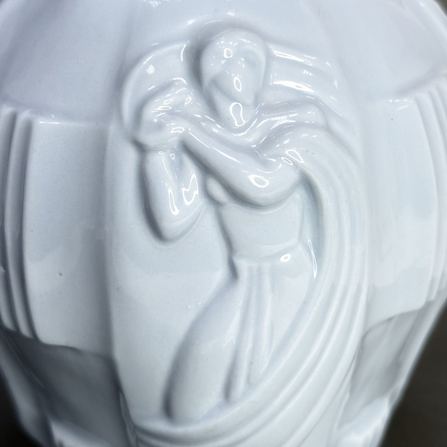 Ваза Ингрид, разработанная Артуром Плевой для Курта Шлевогта в 1936 году, и чаще всего ее можно увидеть в зеленом малахите или синем лазурите, но я никогда раньше не видел ее, сделанную из керамики. Предположительно, это чехословацкая ваза конца 30-х или, может быть, даже 50-х годов. Матово-бело-голубого цвета, с разными обнаженными фигурами, которые окружают всю вазу. В отличном состоянии. Размер: высота 21 см, диаметр тулова 15 см, диаметр основания 8,5 см, диаметр горловины 9 см