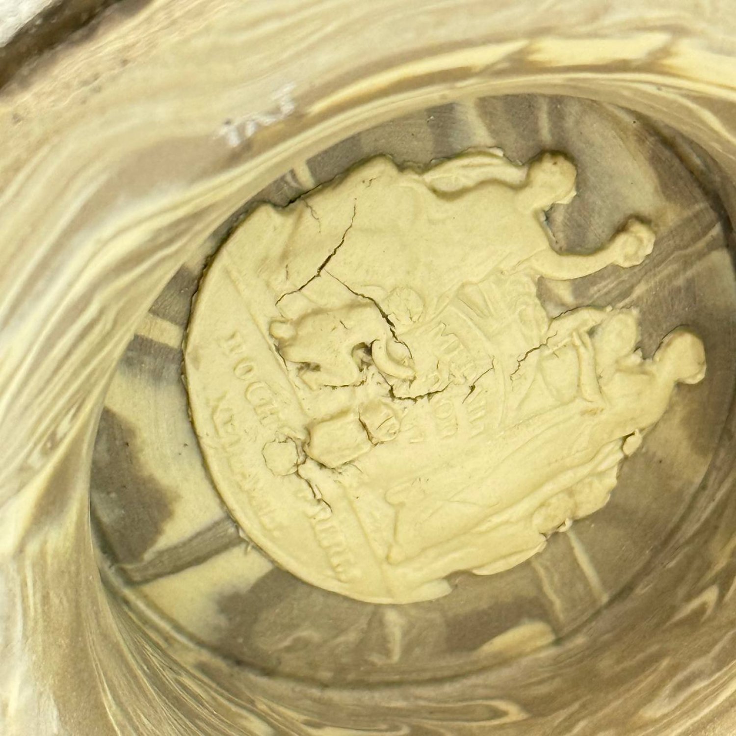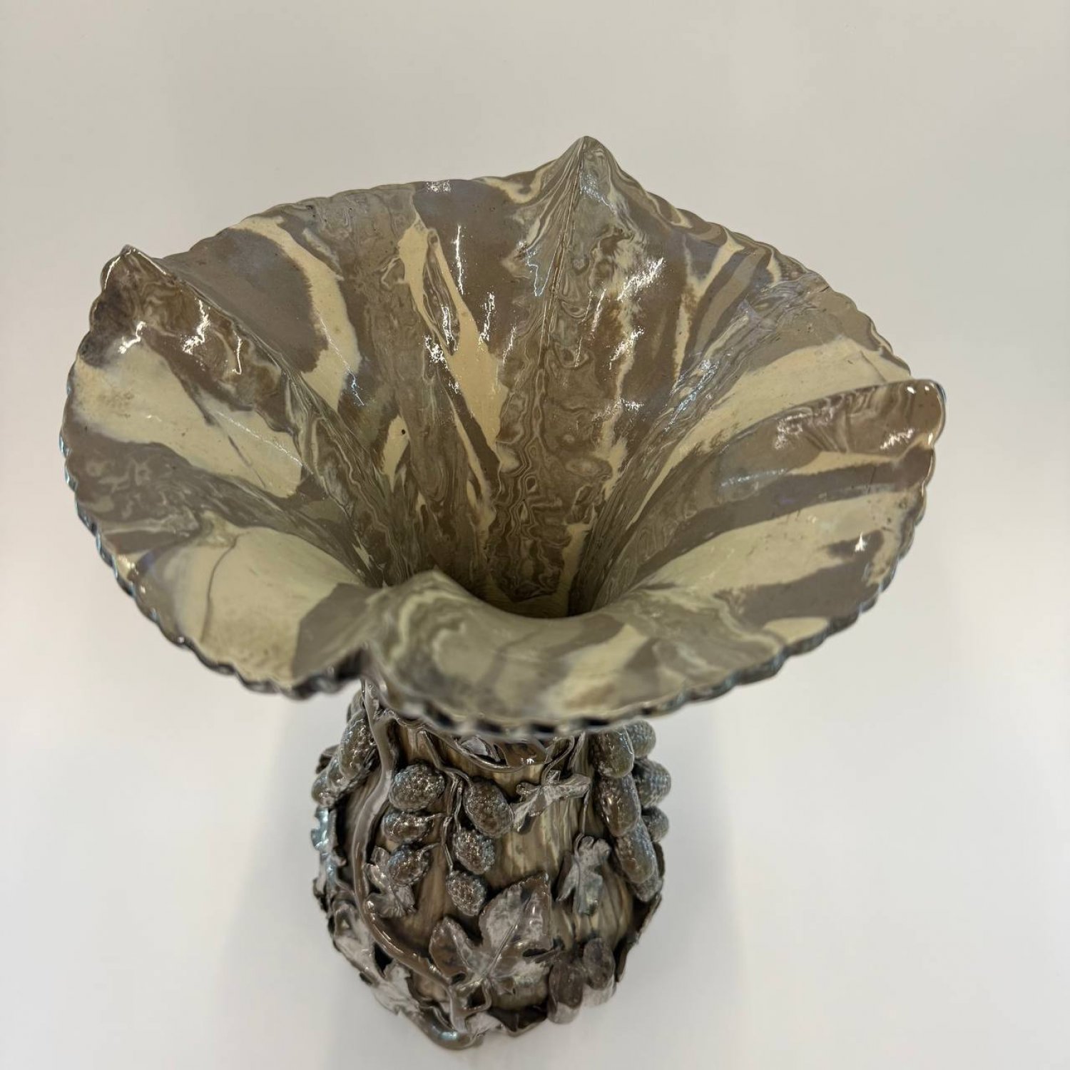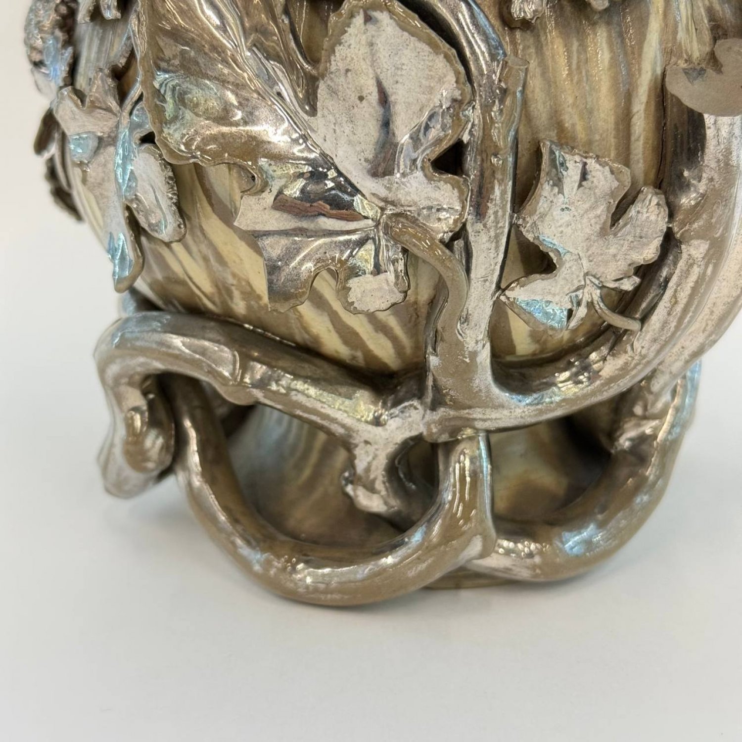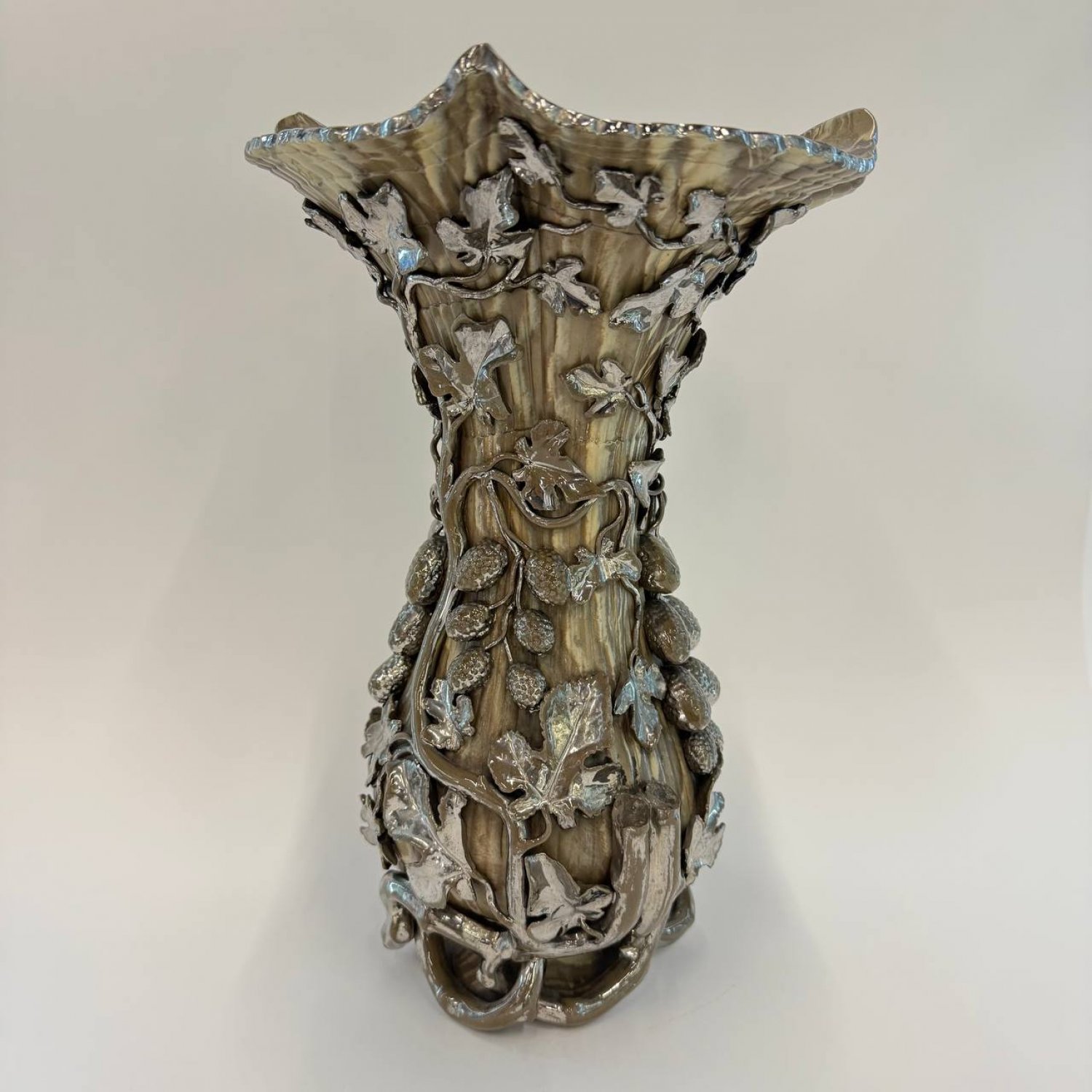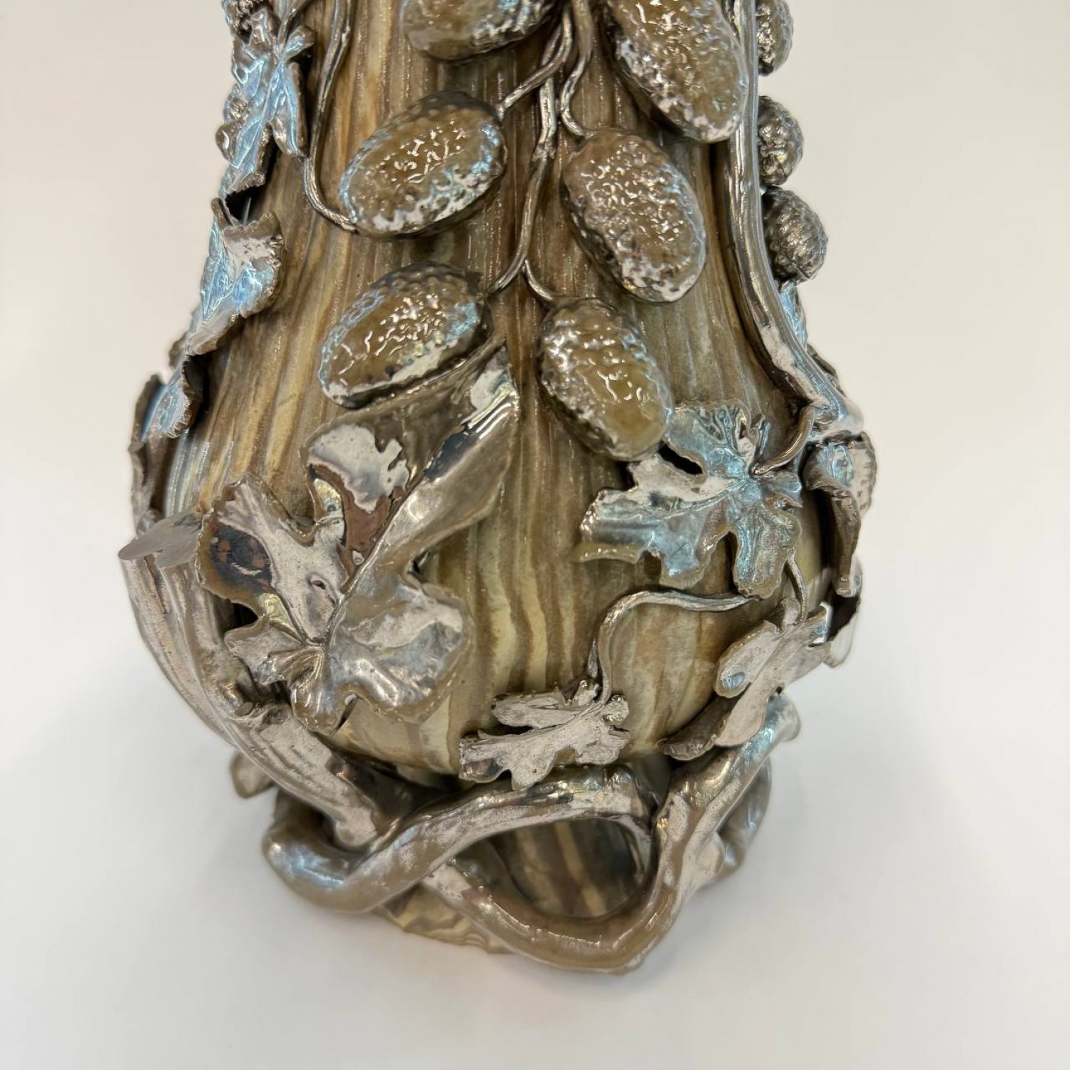 Ваза-амфора, Boch Frères Keramis, Бельгия, ок. 1900 г., керамика с мраморным эффектом, богато переплетенная серебристыми листьями, сколы