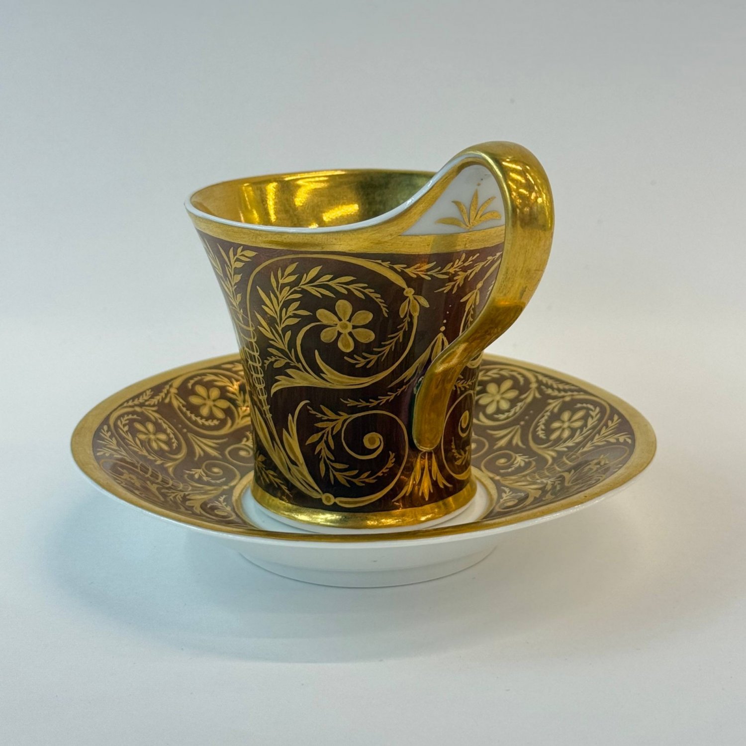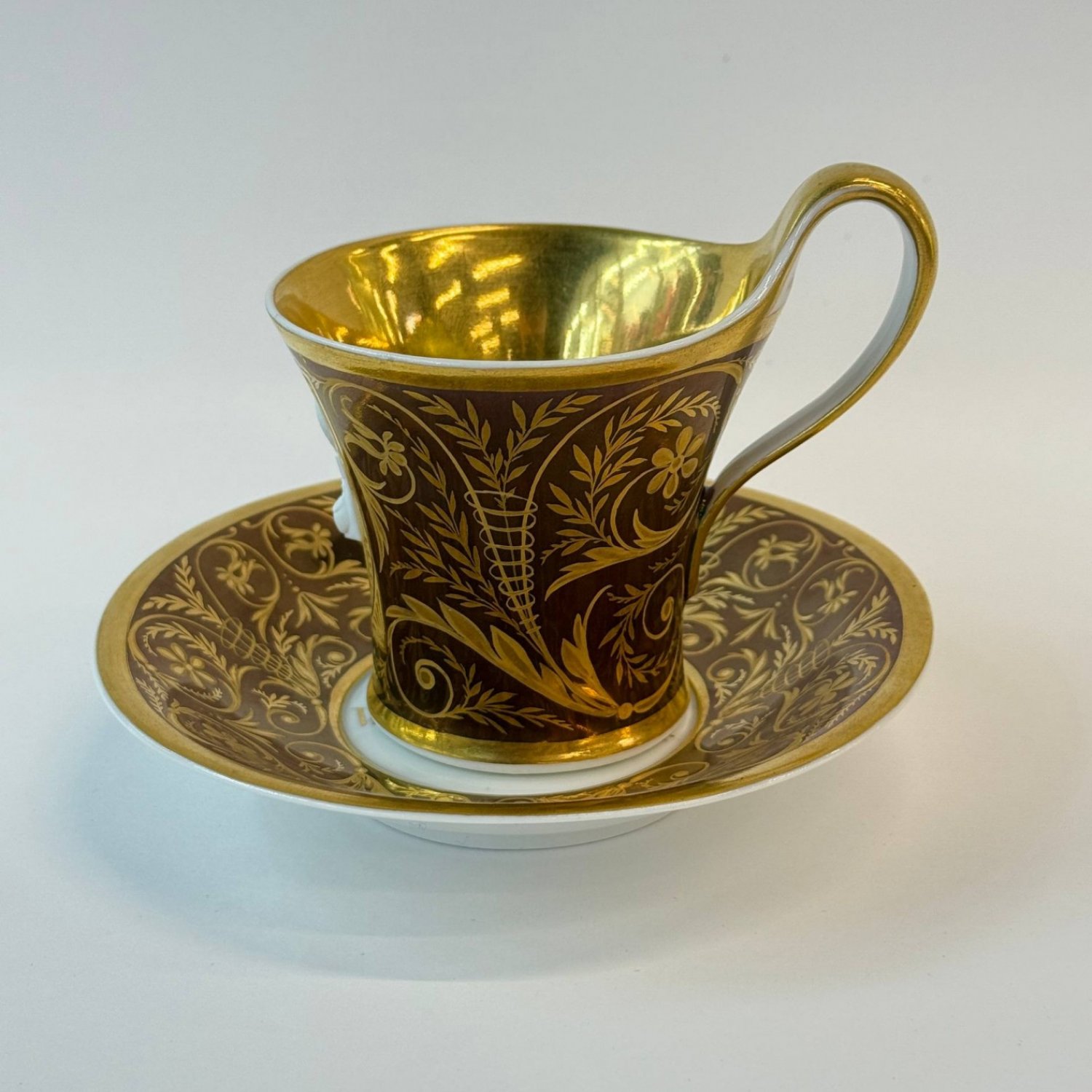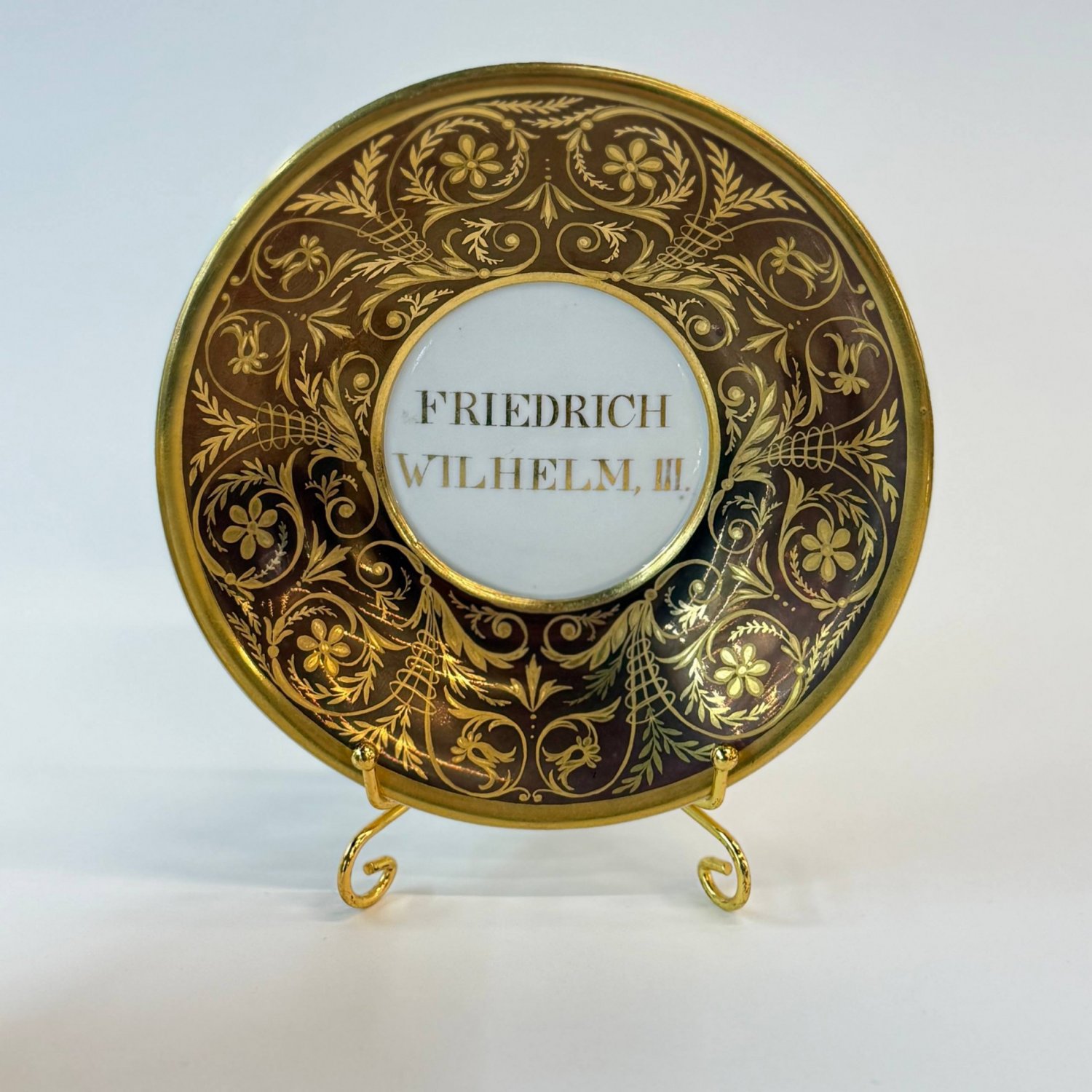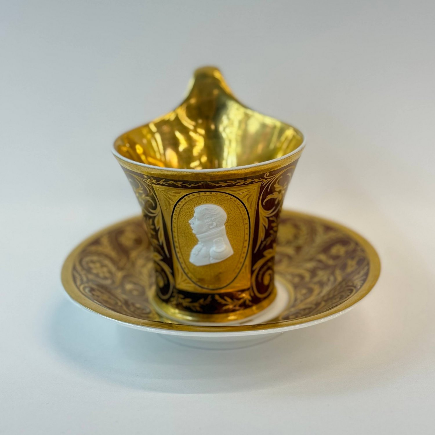 Старинная коллекционная портретная чашка с блюдцем, KPM Berlin, 1820 гг,клеймо художника, форма «калатос» с ручкой-колокольней, на лицевой стороне рельефный медальон с изображением бюста прусского короля Фридриха Вильгельма III из белого бисквита на золотом фоне, богатое орнаментальное золочение со свитками на золотисто-коричневом фоне, на блюдце в зеркале с надписью «ФРИДРИХ ВИЛЬГЕЛЬМ III»